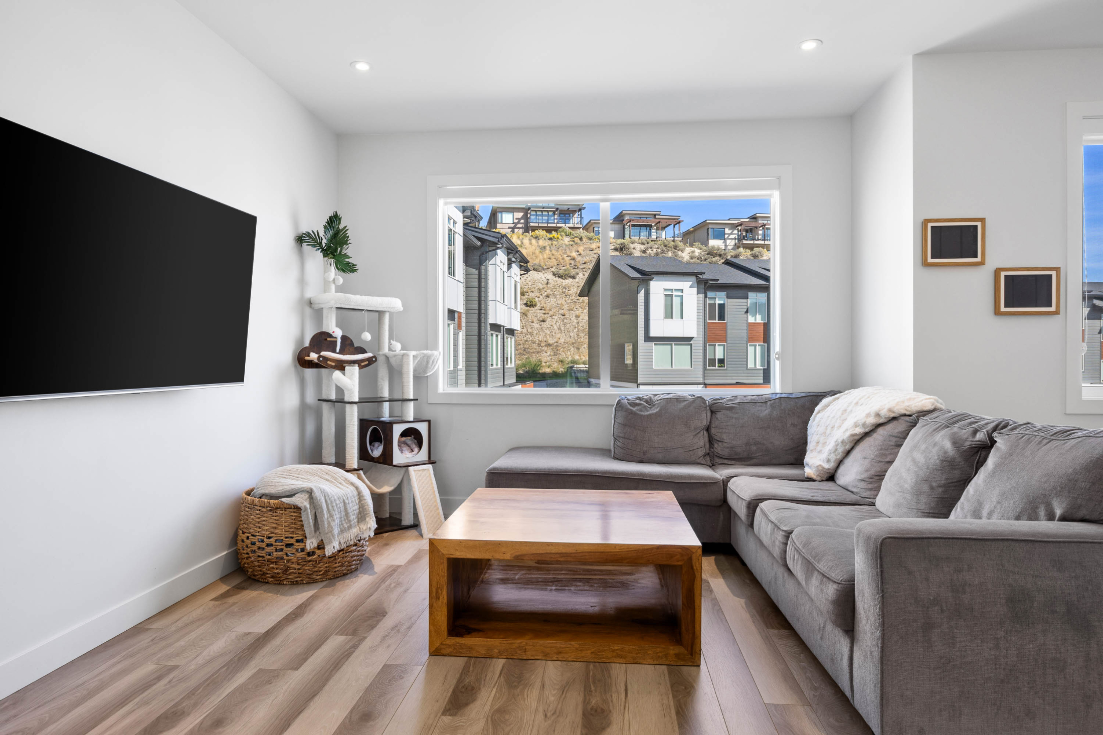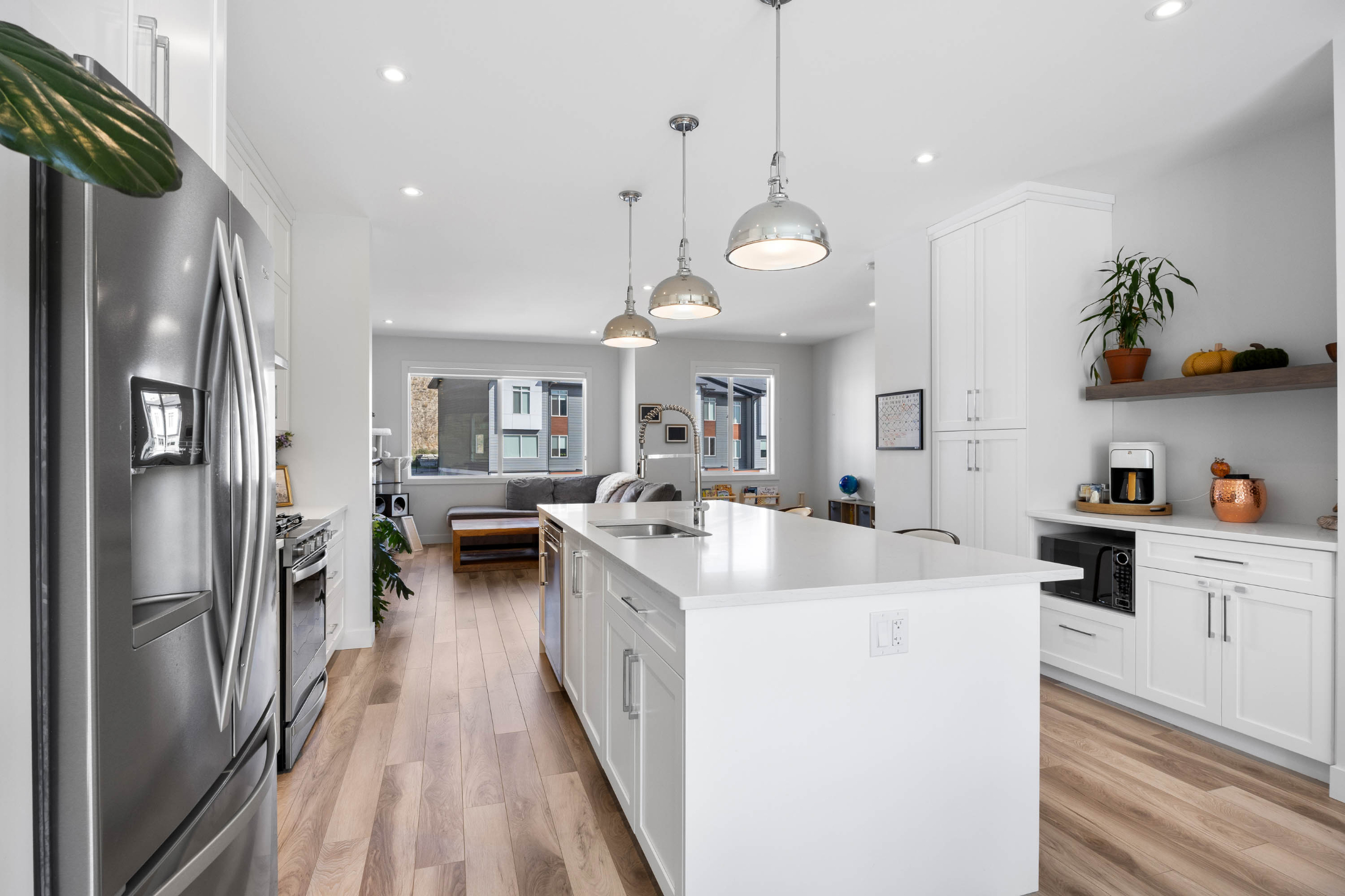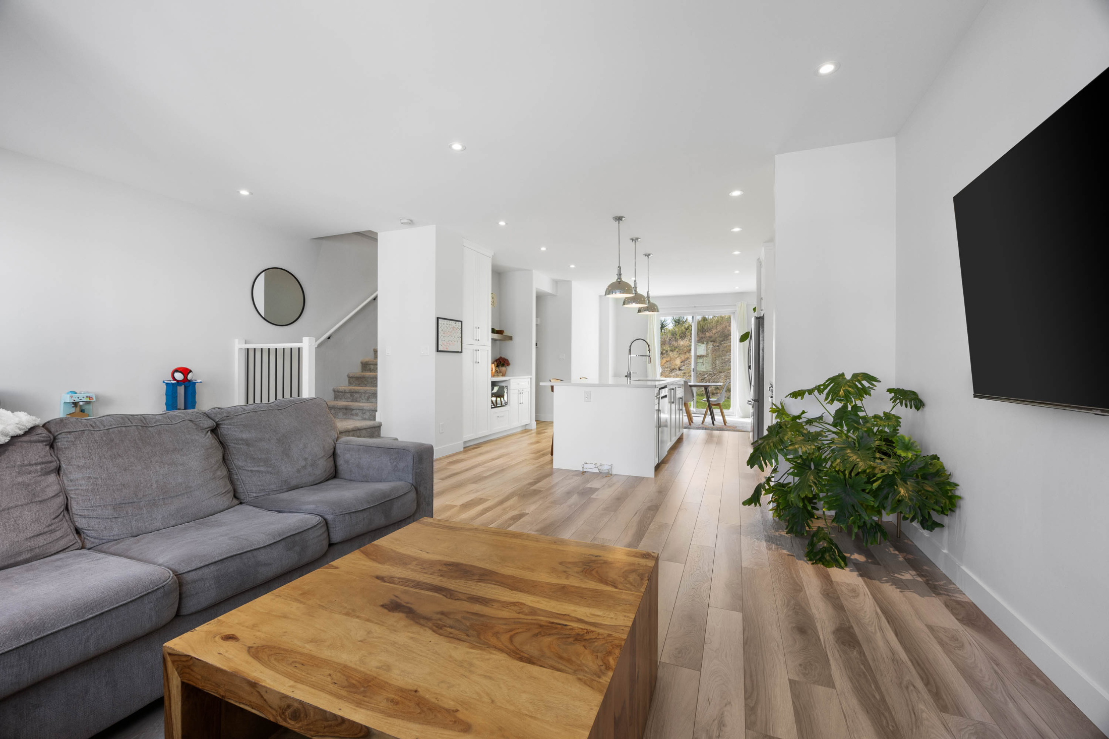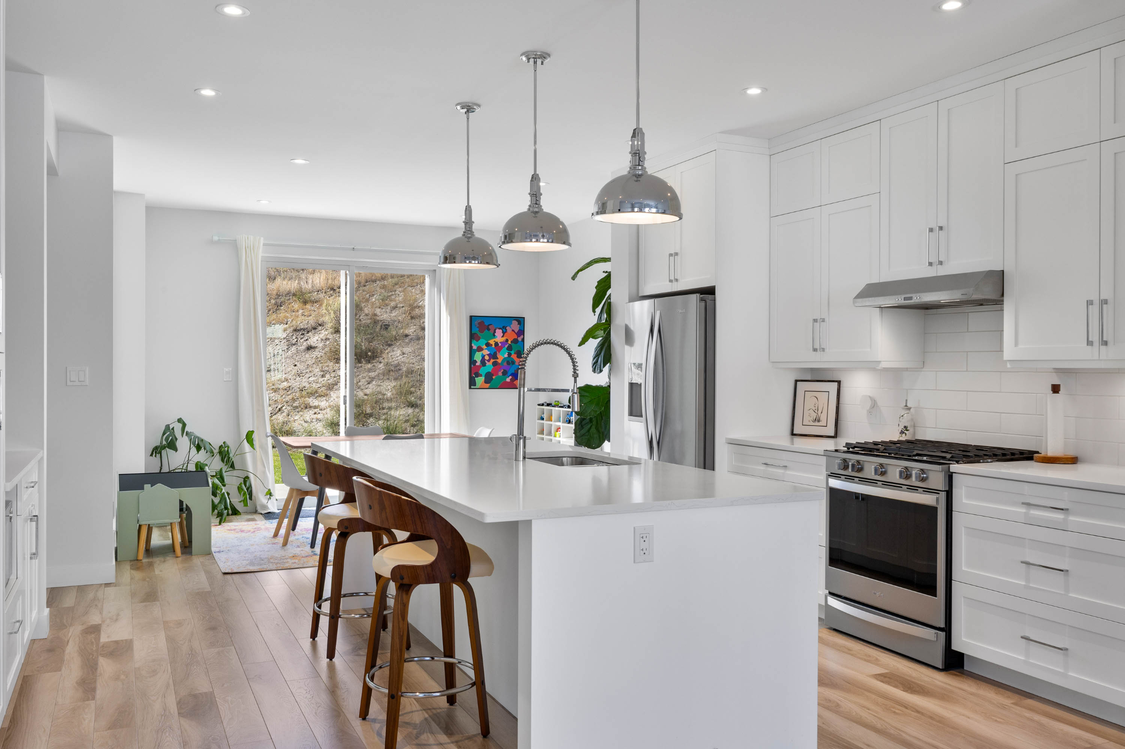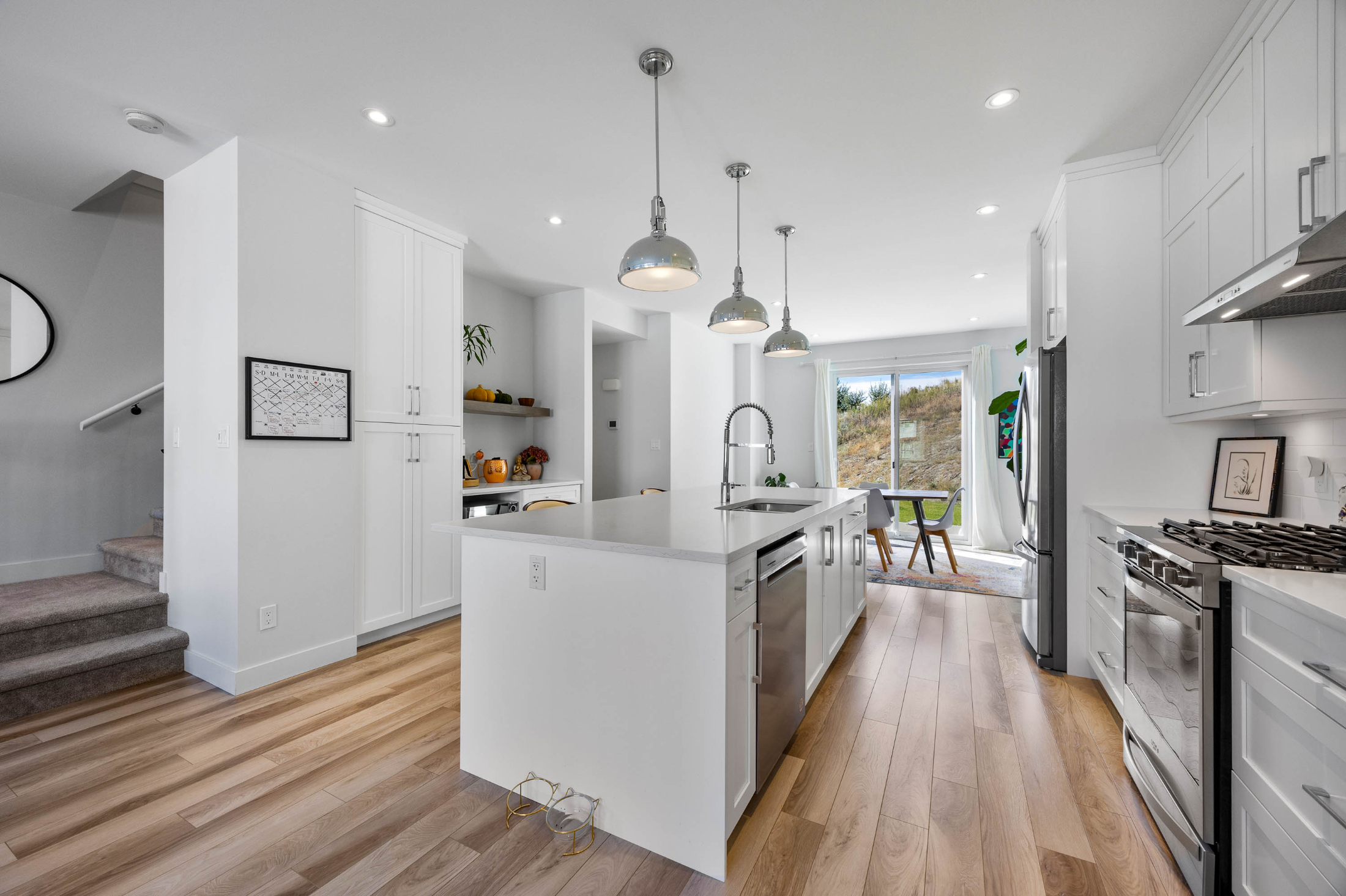On the main floor you will find an inviting open-concept space featuring a large bright kitchen with quartz countertops, a central island, gas range and a built-in coffee bar—perfect for morning routines or entertaining. Sliding glass doors lead to a private patio with fantastic views of the valley. Additionally, you have a natural gas BBQ hook-up and added greenspace thanks to the end-unit location. A 2-piece powder room rounds out the floor.