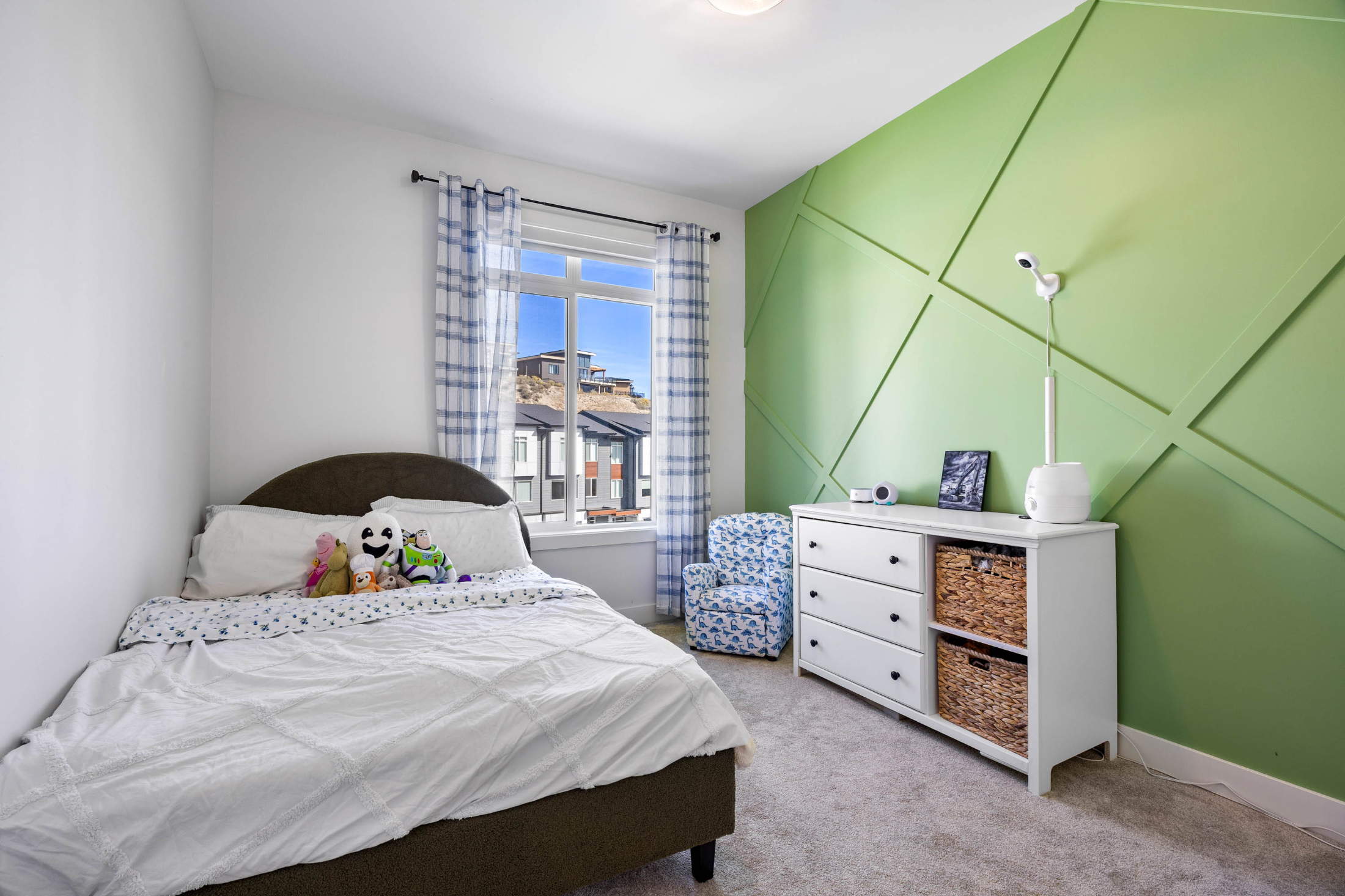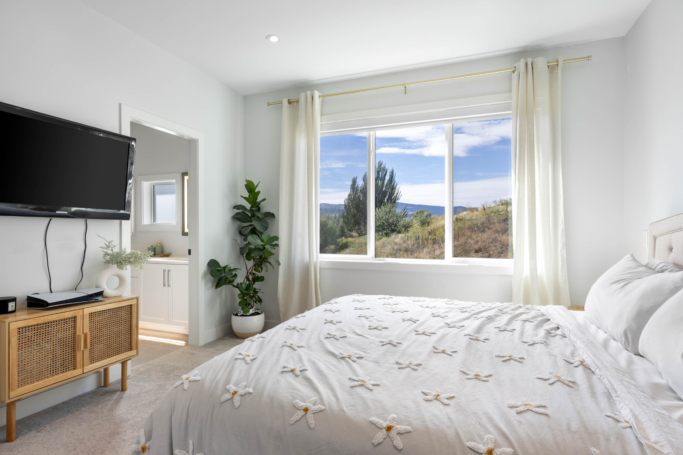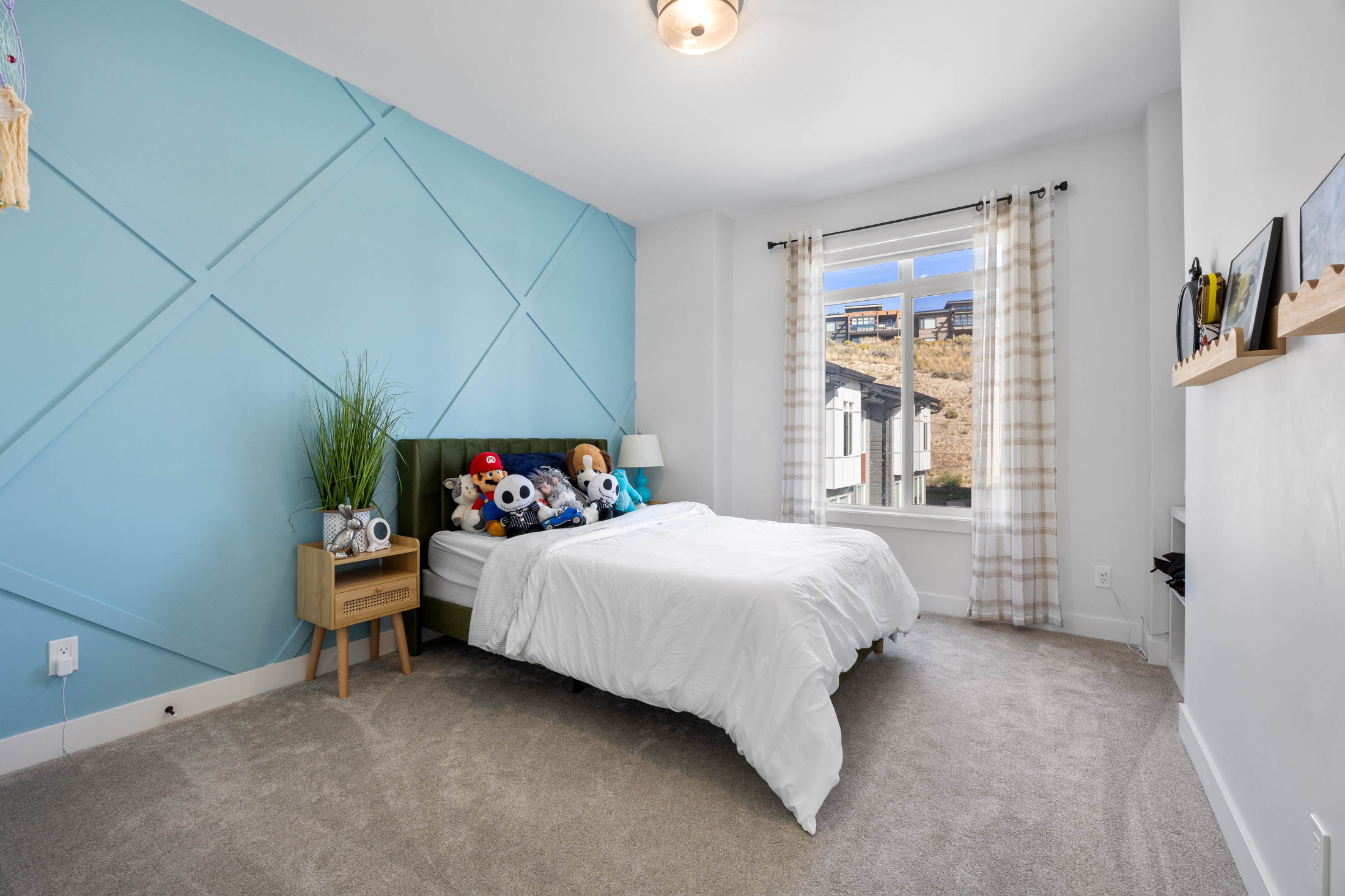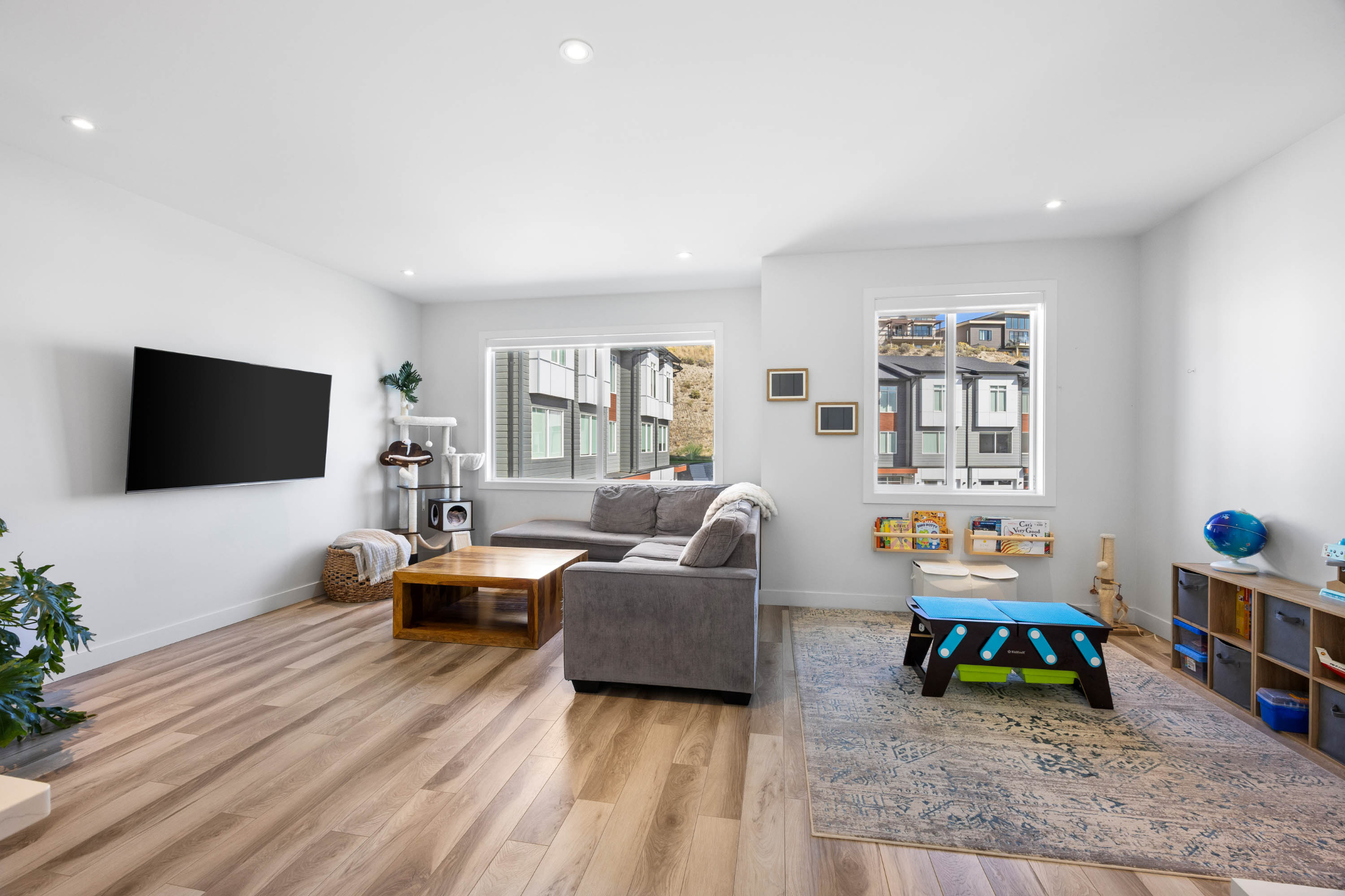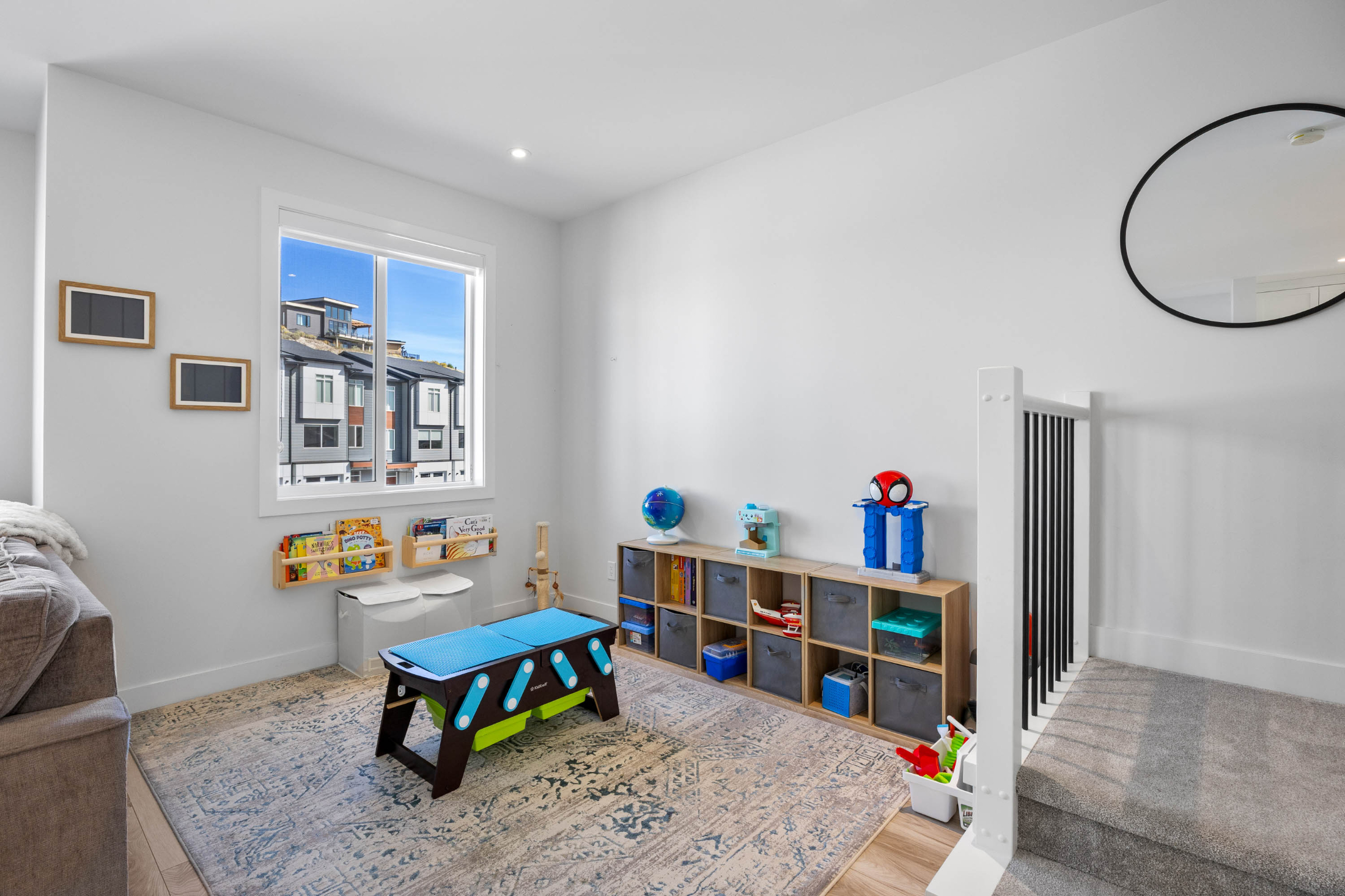On the main floor you will find an inviting open-concept space featuring a large bright kitchen with quartz countertops, a central island, gas range and a built-in coffee bar—perfect for morning routines or entertaining. Sliding glass doors lead to a private patio with fantastic views of the valley. Additionally, you have a natural gas BBQ hook-up and added greenspace thanks to the end-unit location. A 2-piece powder room rounds out the floor.