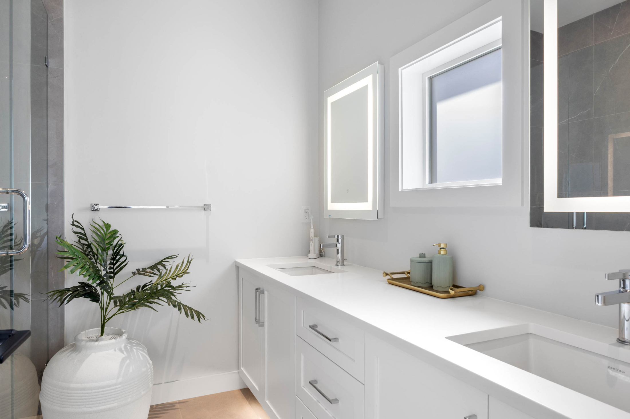 Upstairs are three generous bedrooms including a spacious primary retreat on the view side, complete with a walk-in closet and luxurious 3-piece ensuite featuring a double vanity. A well-designed laundry area with built-in shelving is also located on the top level with another 4-piece main bathroom.