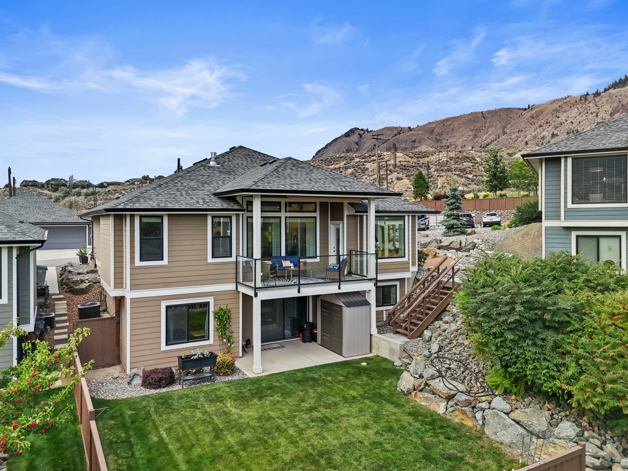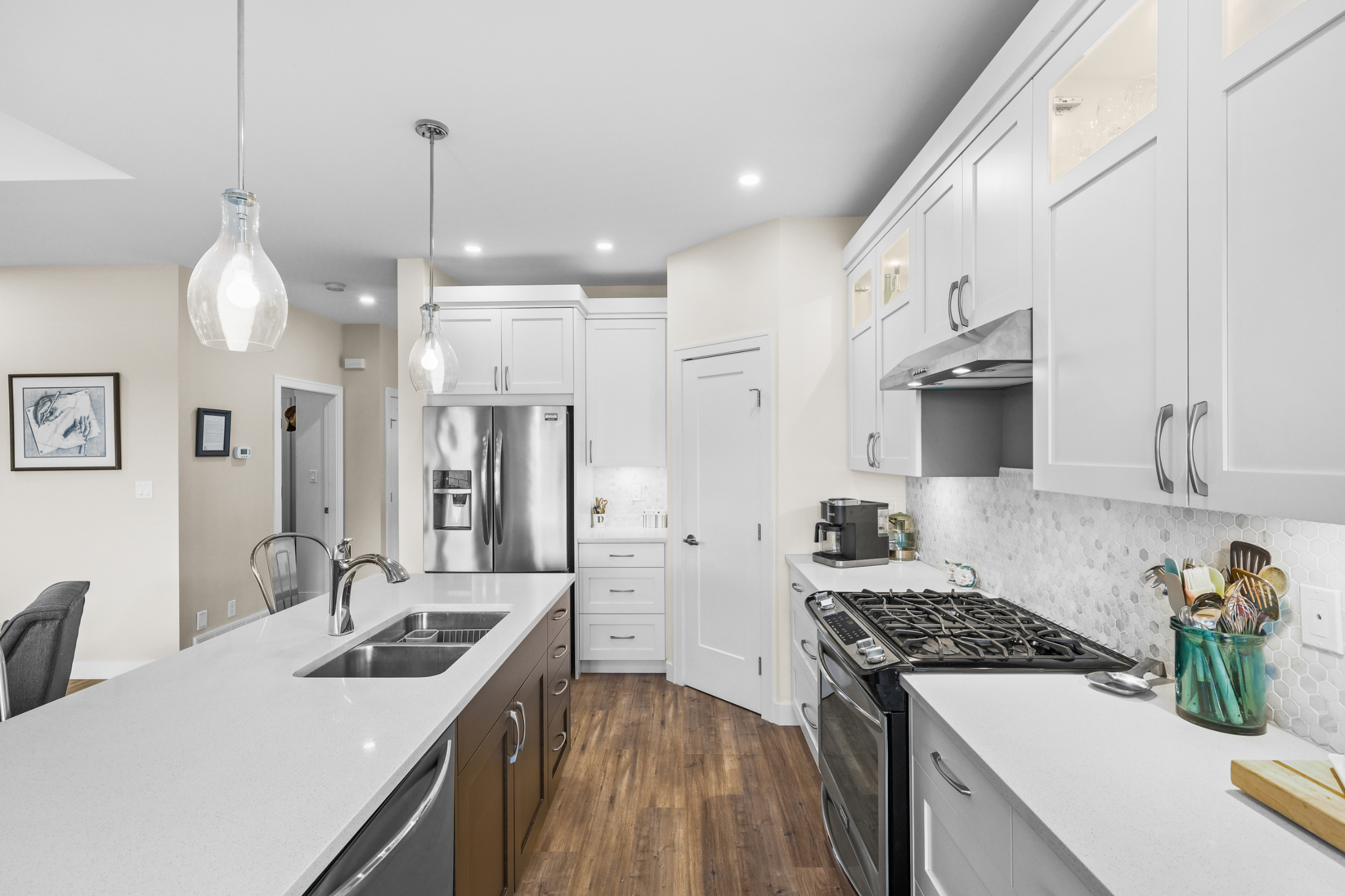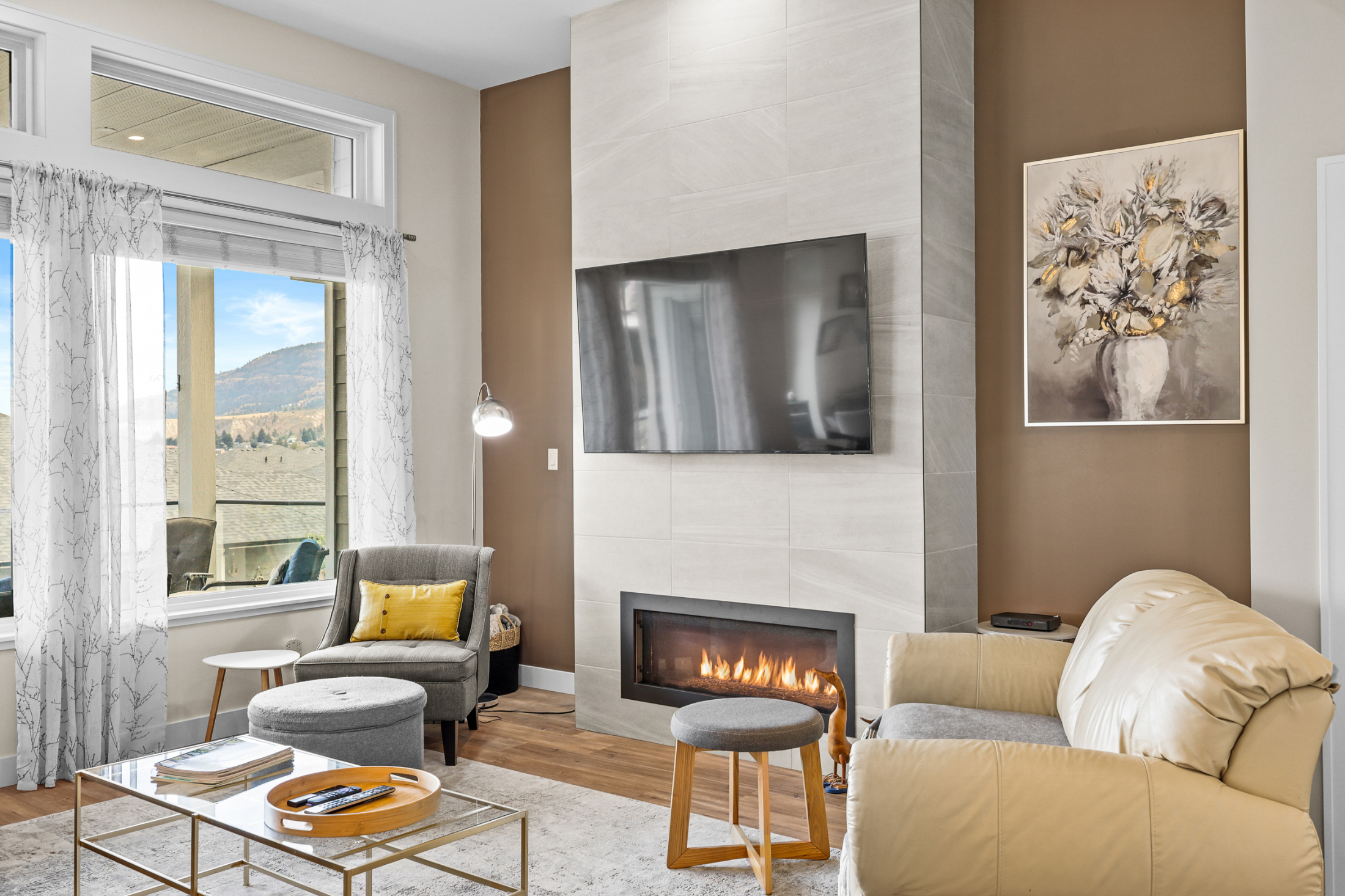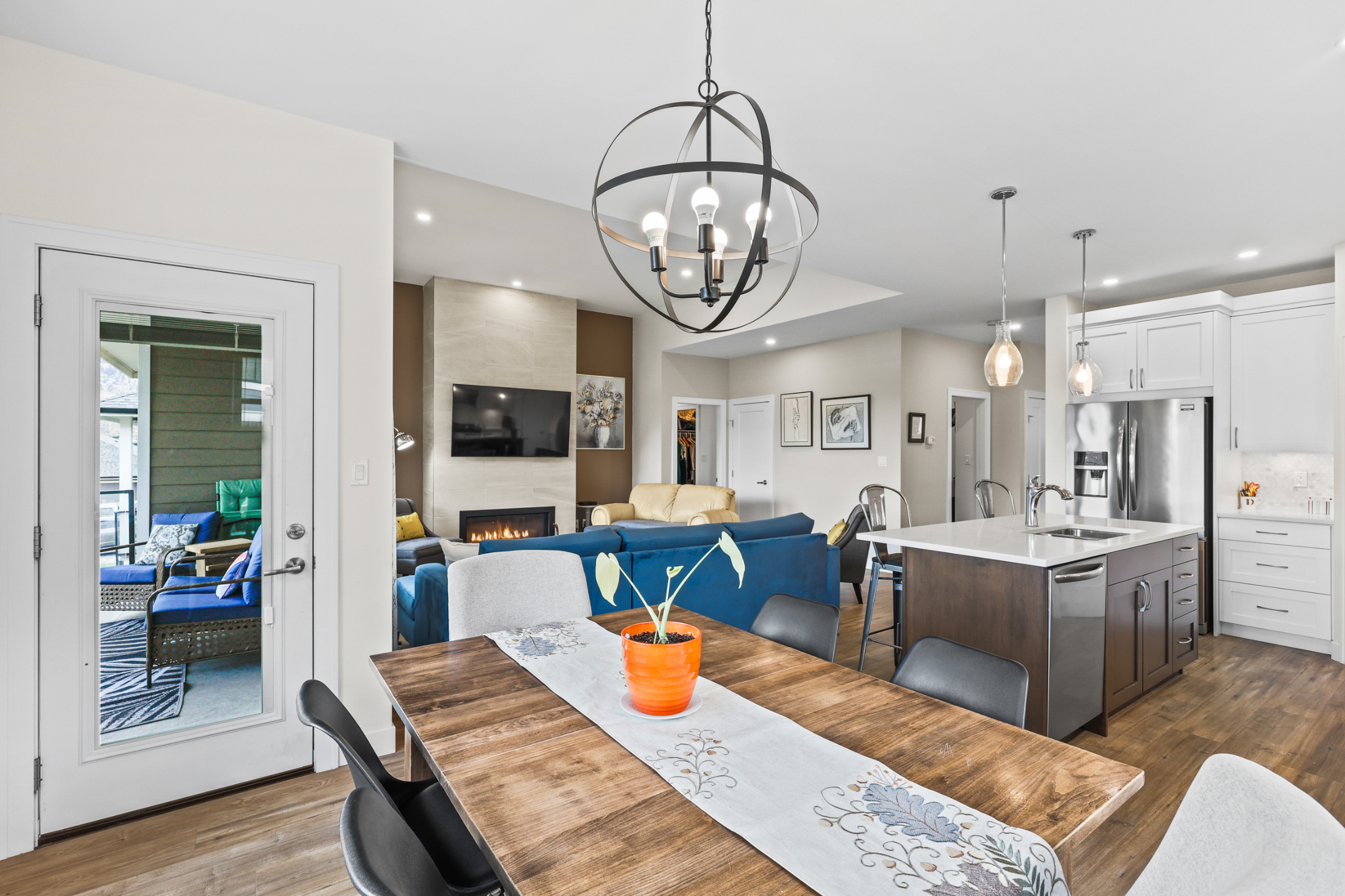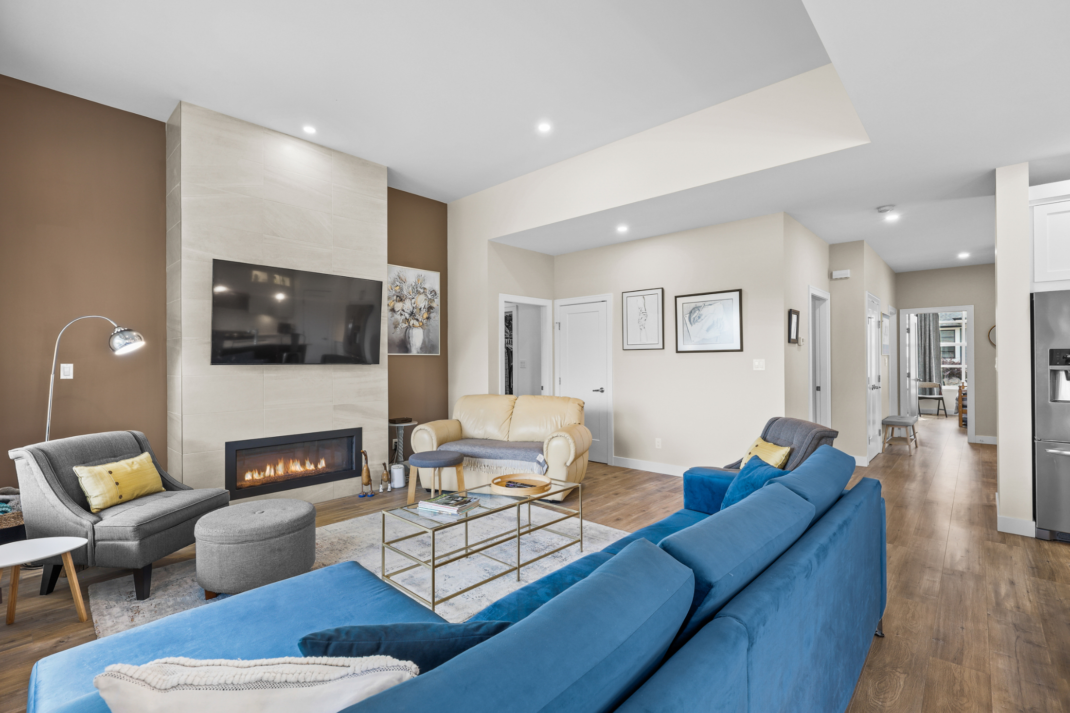 The main floor is open concept with large windows, 11ft ceilings, new floors (2025), and a gorgeous kitchen. The kitchen features stone countertops, ample cupboard space, gas range, cupboard backlighting, and a large island that is perfect for entertaining. Adjacent to the kitchen is a dining area with room to accommodate a large table, and a living room with high-end gas fireplace feature. Off the dining room is a large covered deck with a great view.