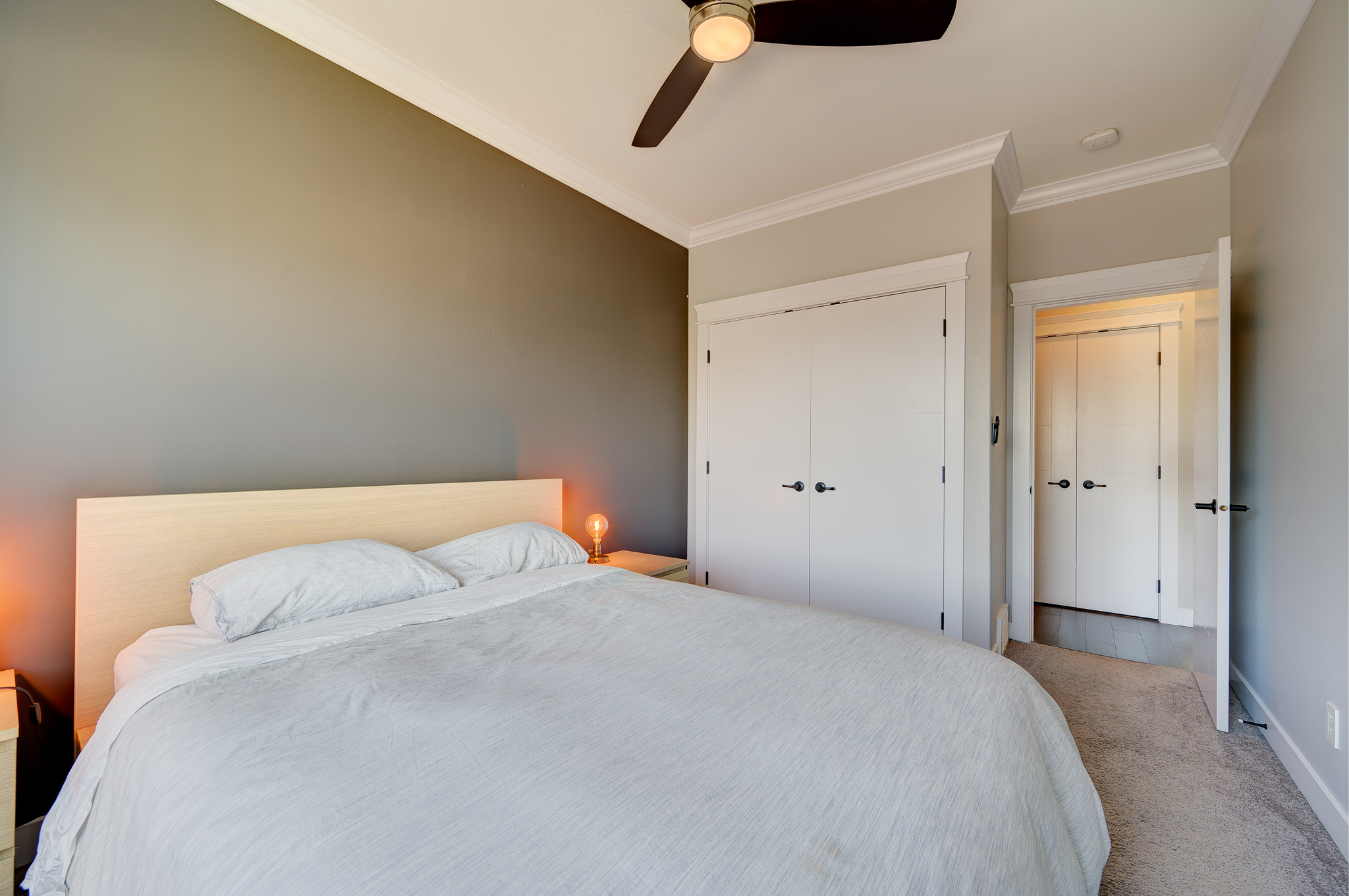 Ascend to the main living space where you will find a 9 foot ceilings and crown moldings throughout, nice sized living room with fireplace and beautiful river and city views. The living room flows through to the kitchen and dining room space with a southwest covered patio. The kitchen is well equipped with quartz countertops, stainless steel appliances, lots of cupboard space and modern finishes. There are 2 good sized bedrooms which include custom closet organizers and a full 4 piece bathroom. To finish off the space there is in suite laundry and storage.