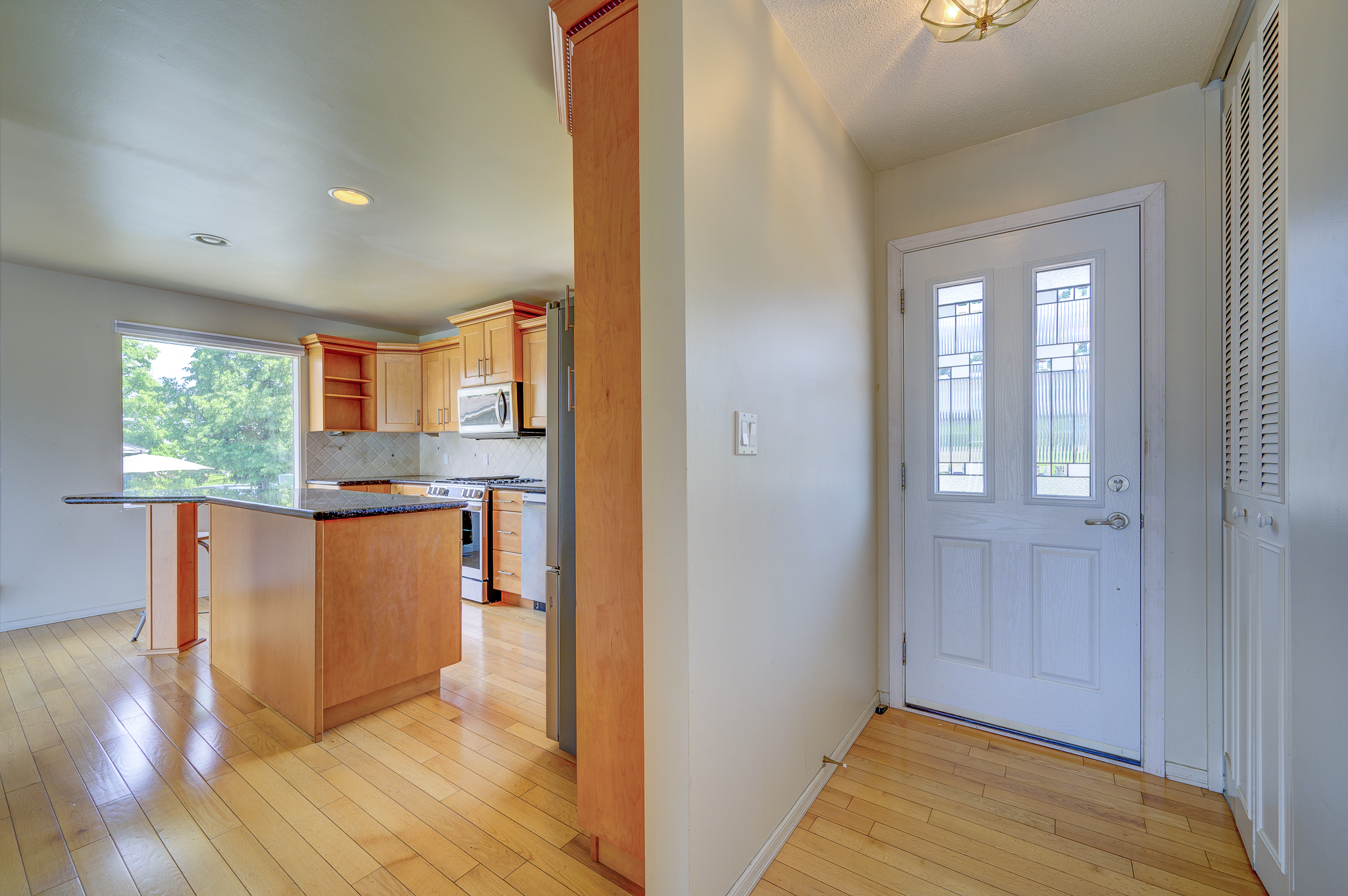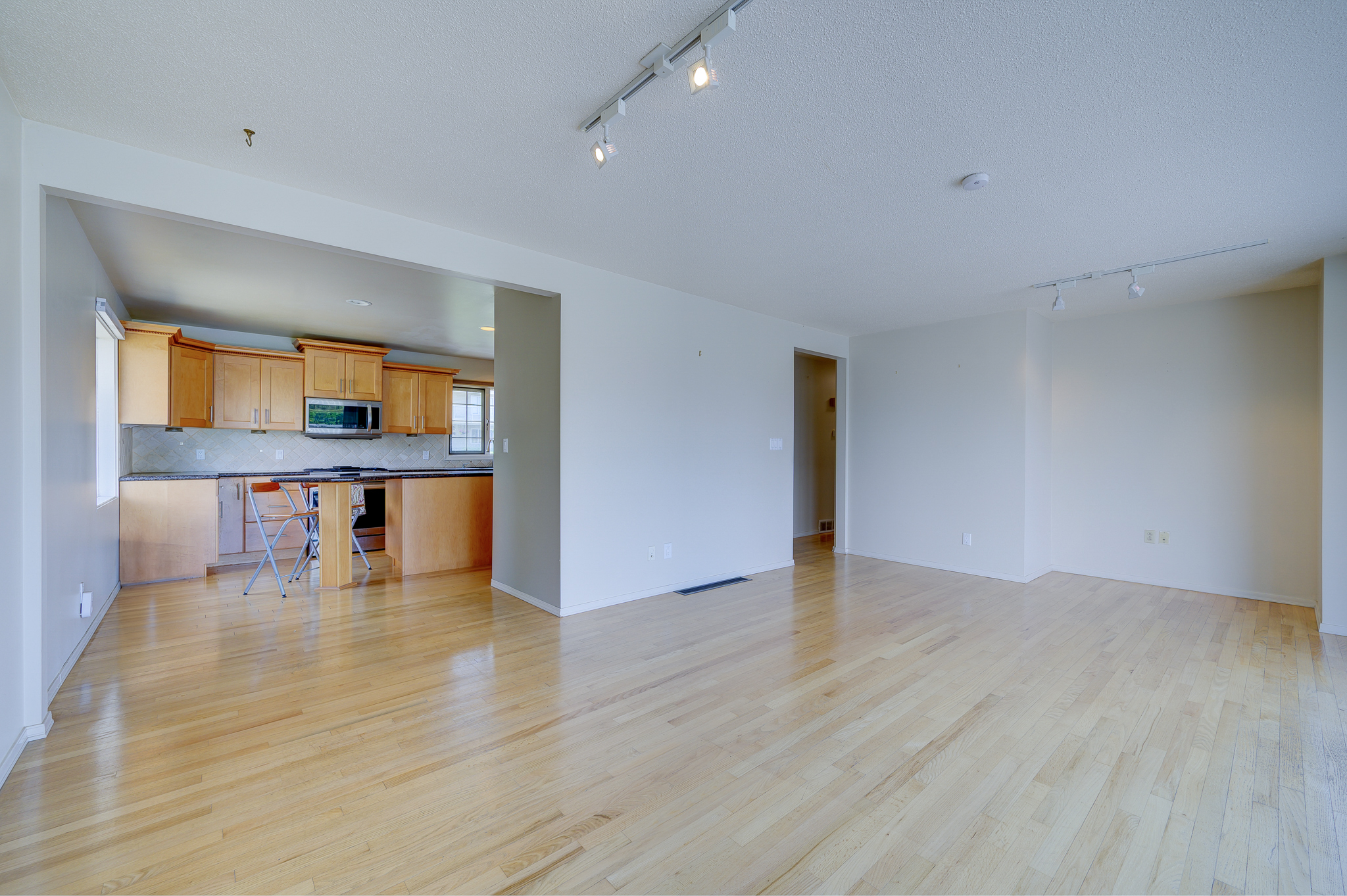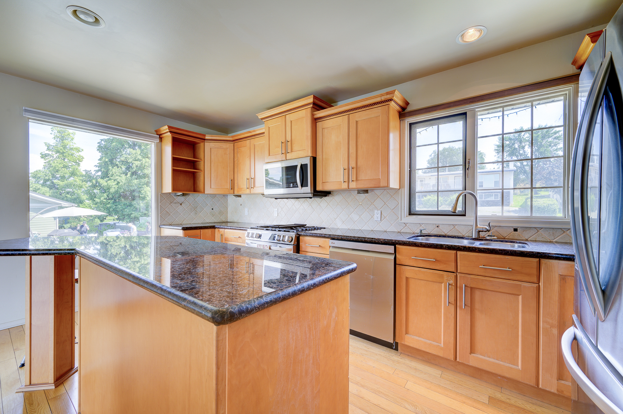 Walk through the main floor of this home and you will see so much potential! There is hardwood flooring running throughout the main floor. The kitchen is updated with stone counters, stainless steel appliances including a gas range and lots of cabinet space. The kitchen flows through to the living and dining room space which have lots of windows for natural light and a sliding glass door leading to the large patio with stair access to the yard.