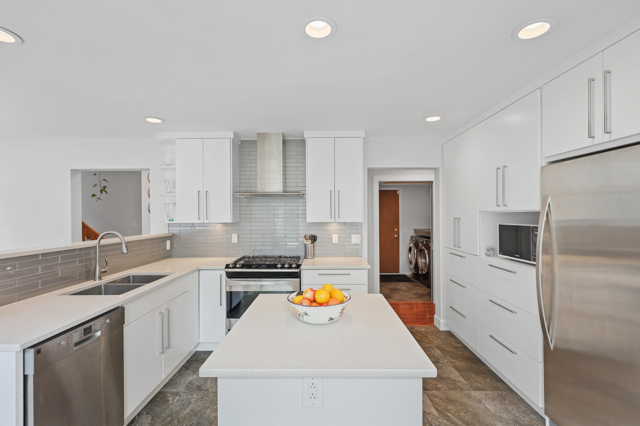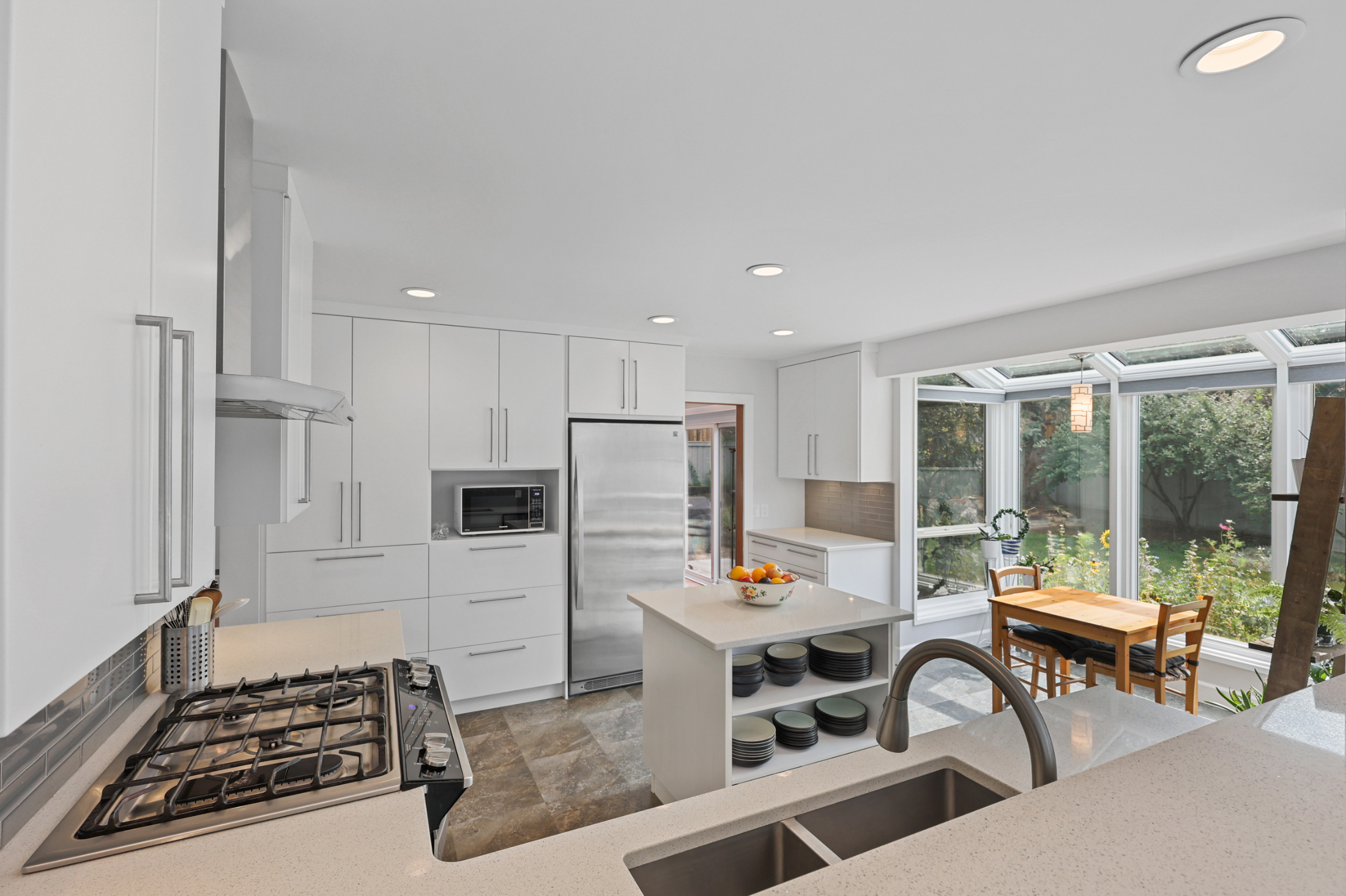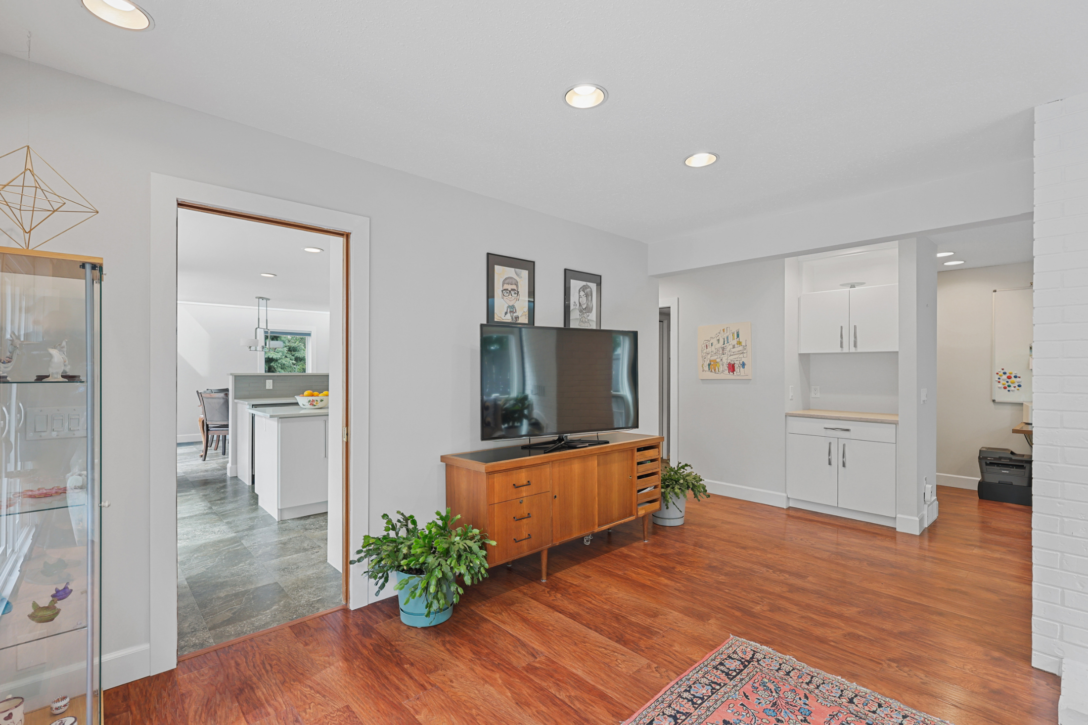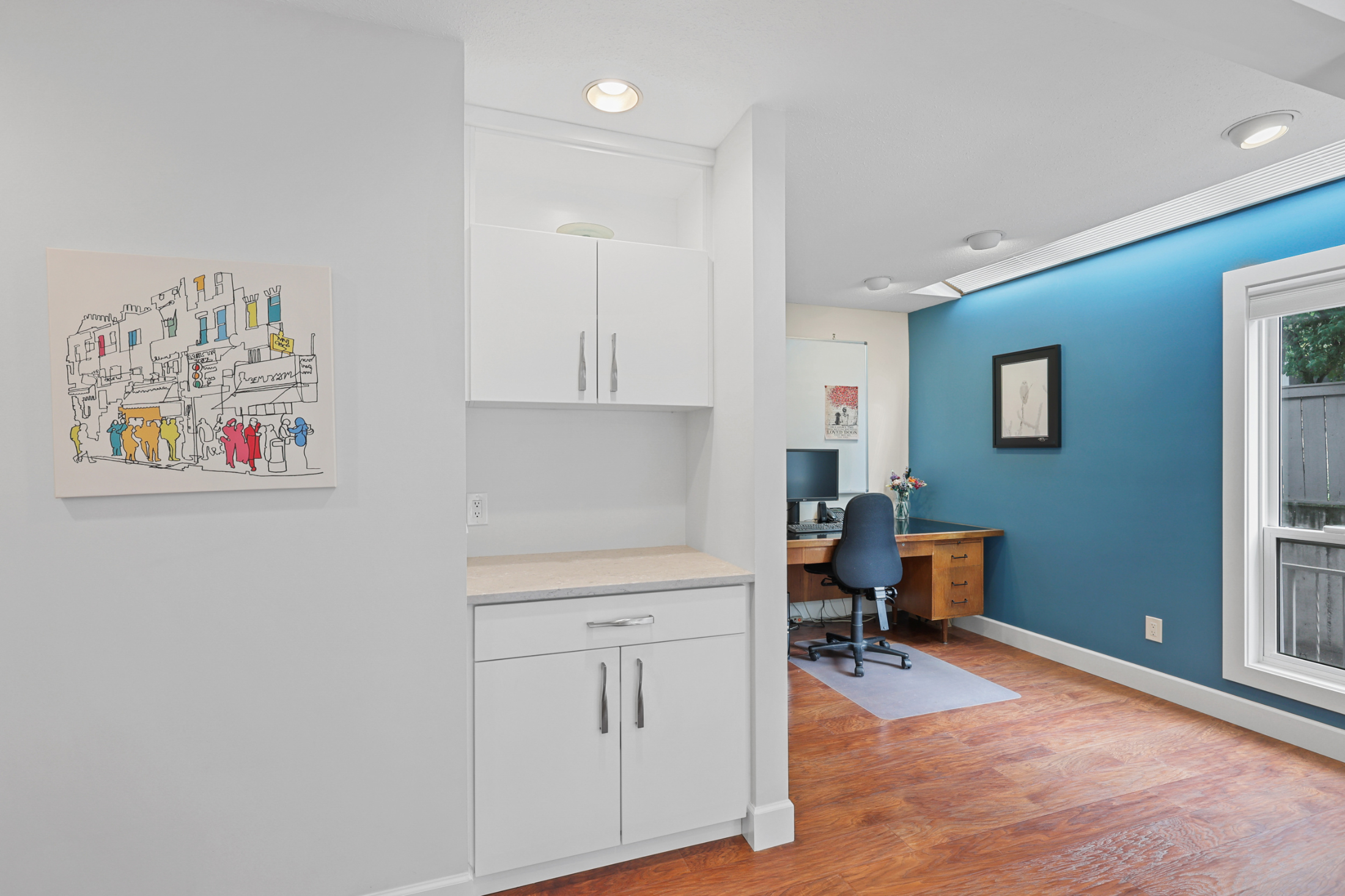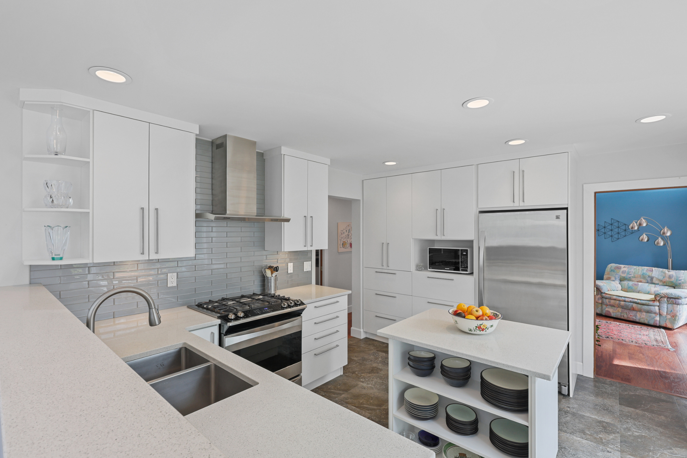 Off of the main entry there is a large formal living room with vaulted ceiling, updated fireplace, flooring and paint. The kitchen was fully gutted and renovated with white custom cabinetry and stone counters. There is a cute nook overlooking the flat private yard. Off of the kitchen there is a family room with yard access and an office space.