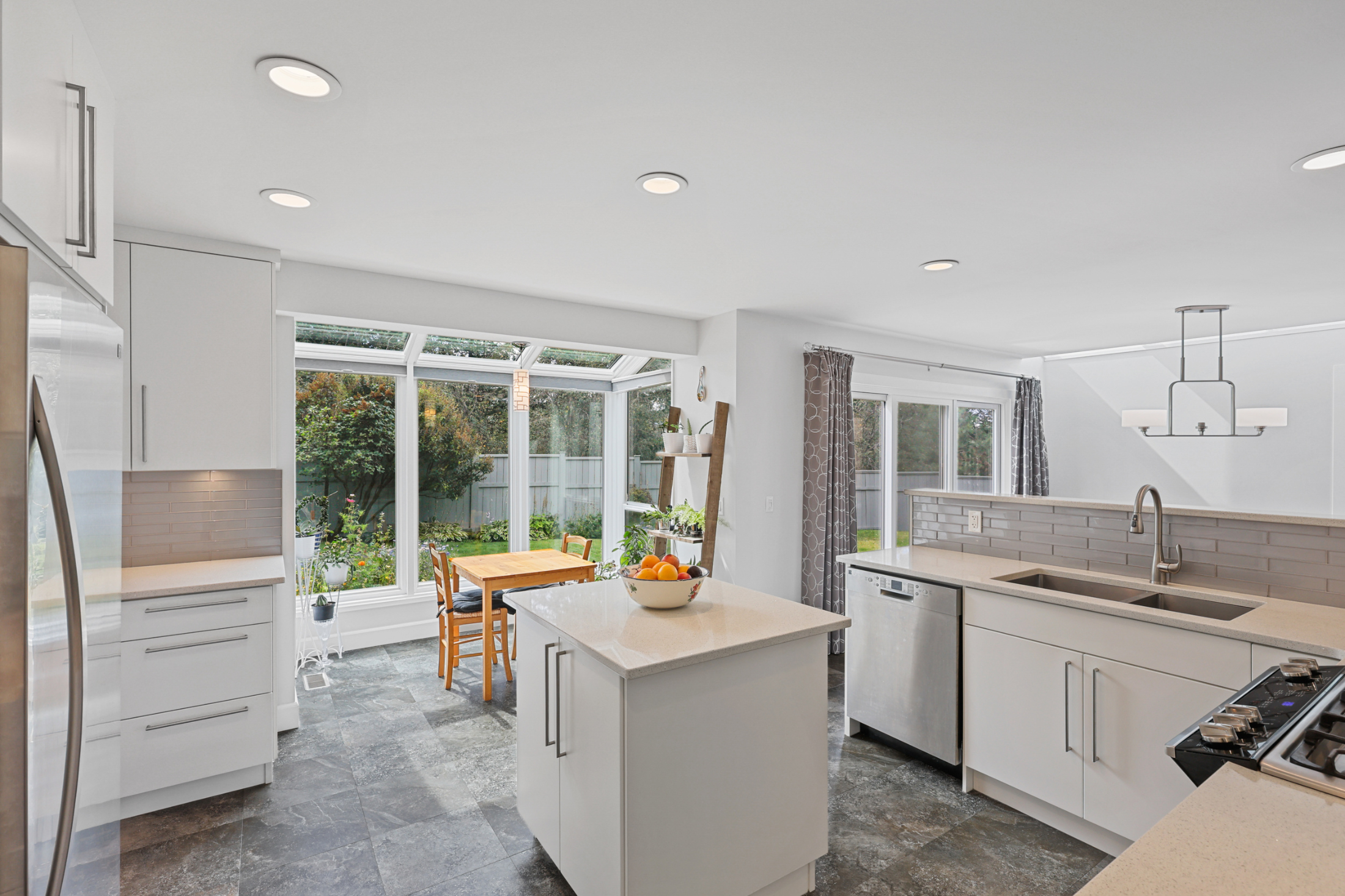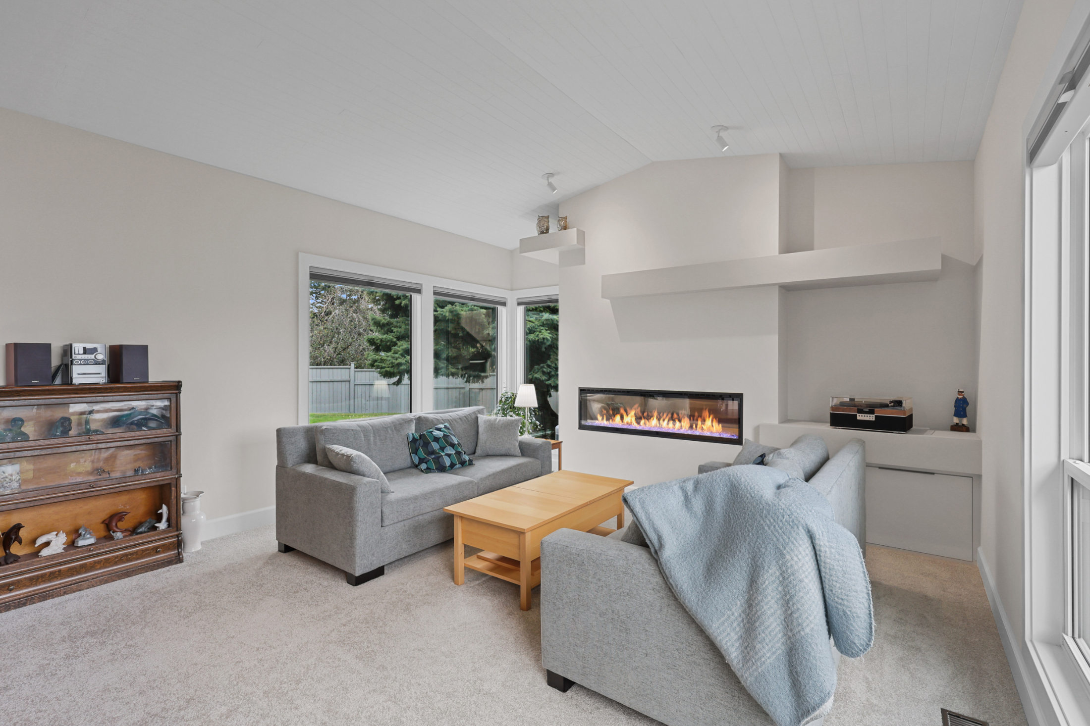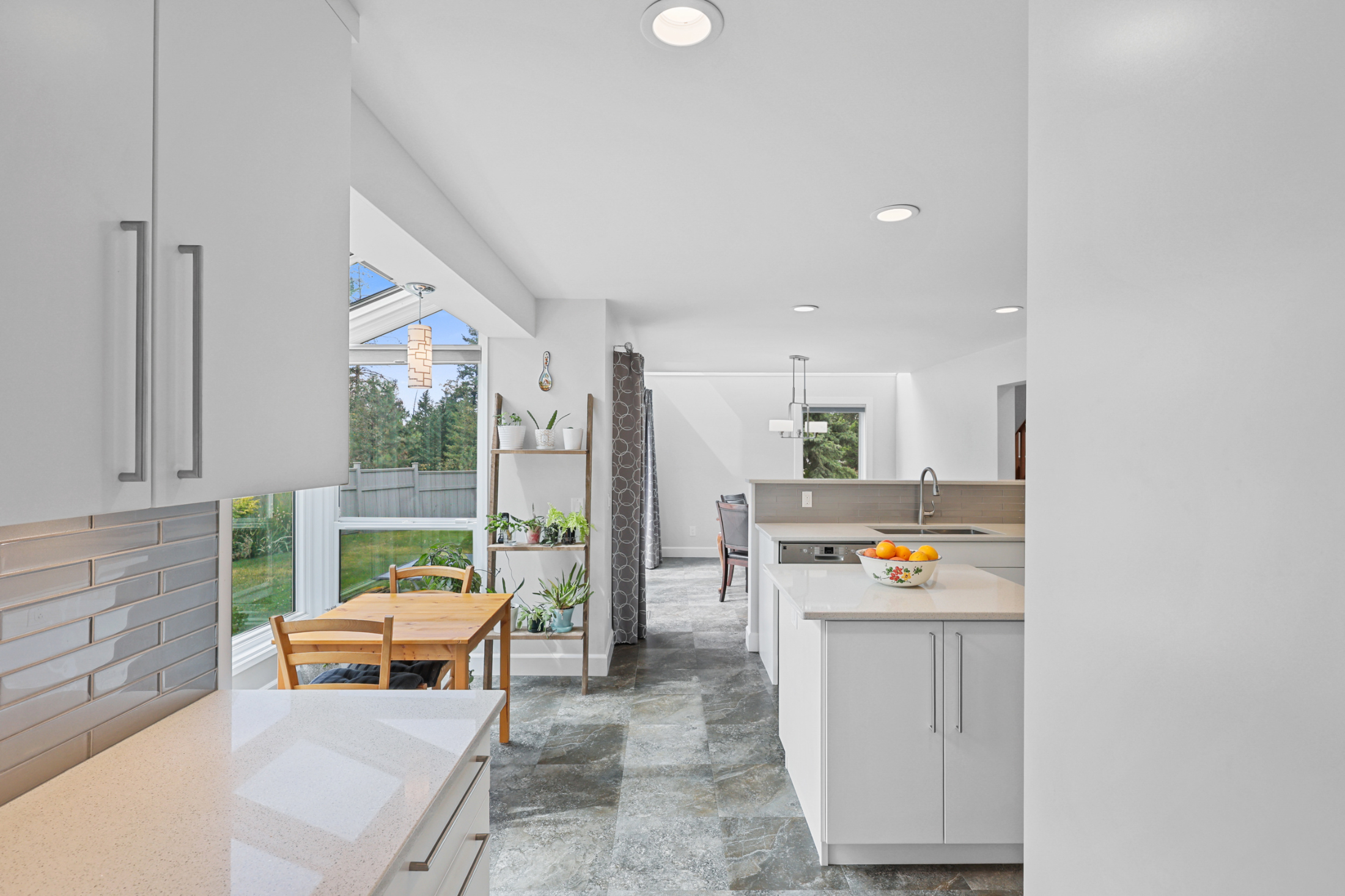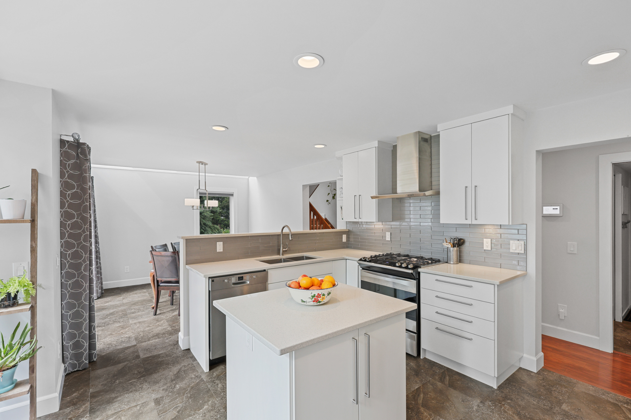 Off of the main entry there is a large formal living room with vaulted ceiling, updated fireplace, flooring and paint. The kitchen was fully gutted and renovated with white custom cabinetry and stone counters. There is a cute nook overlooking the flat private yard. Off of the kitchen there is a family room with yard access and an office space.