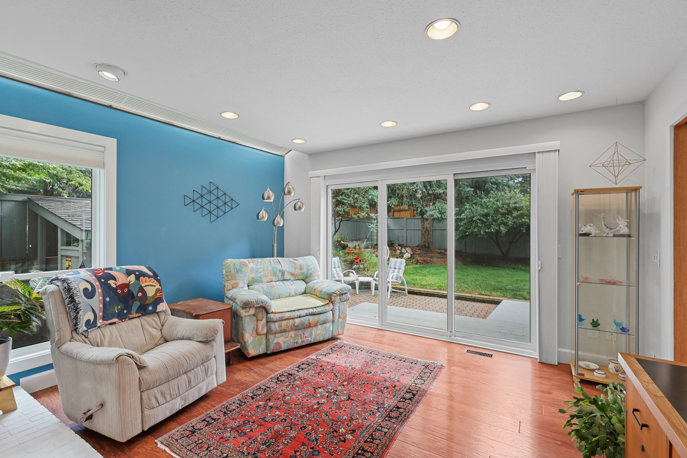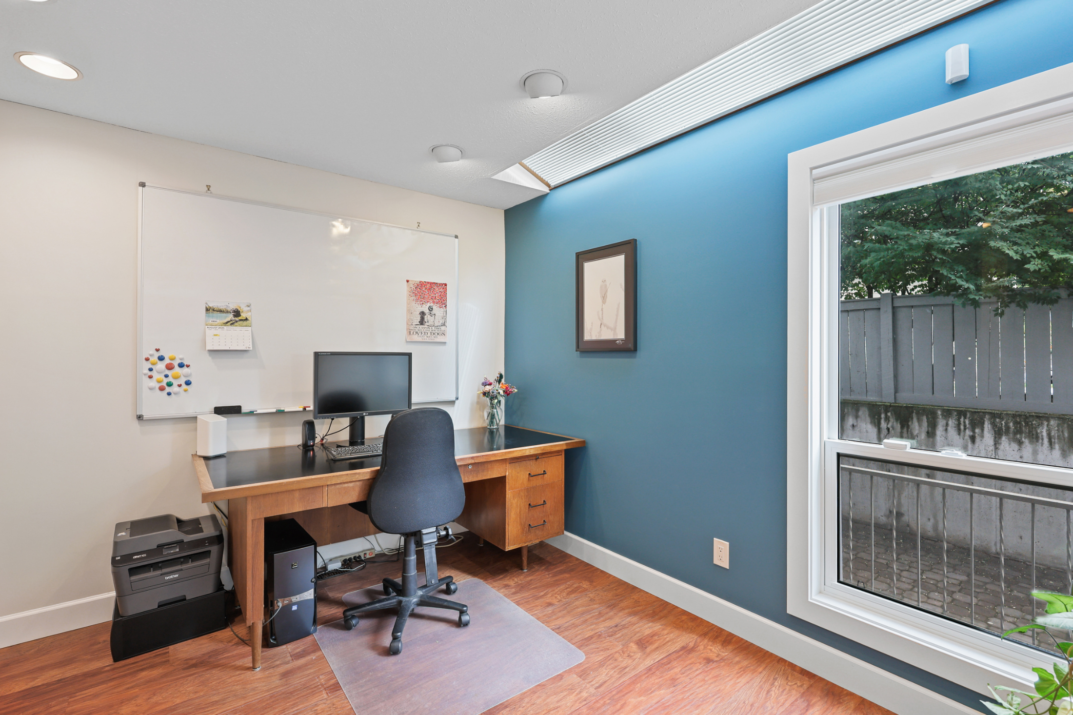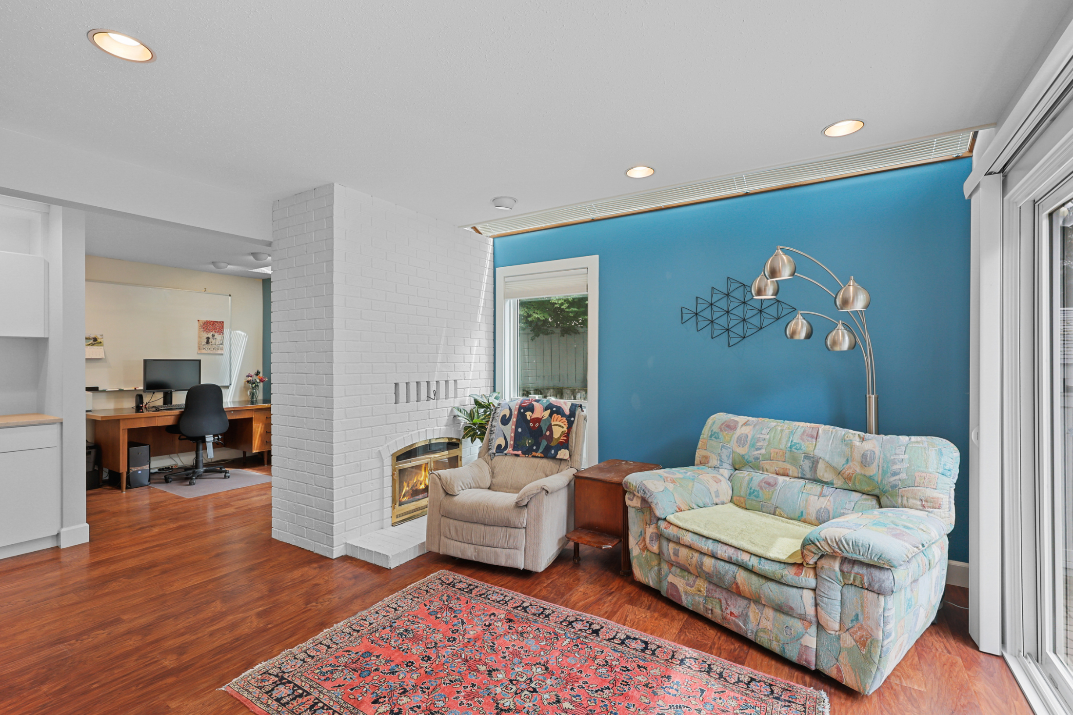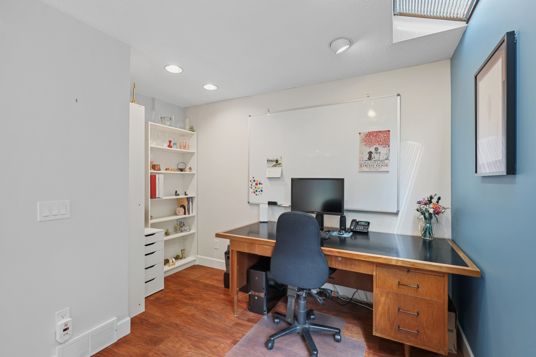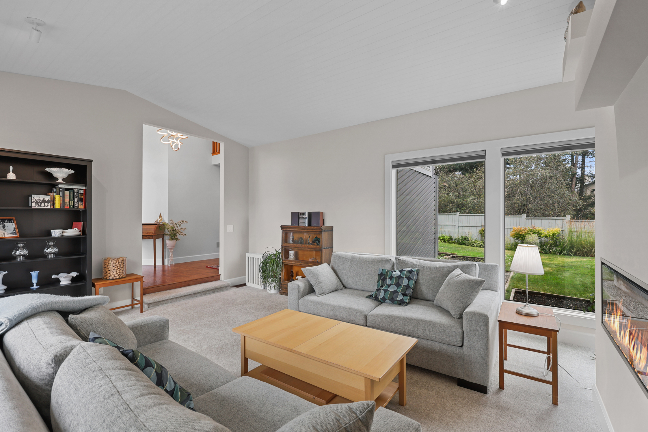 Off of the main entry there is a large formal living room with vaulted ceiling, updated fireplace, flooring and paint. The kitchen was fully gutted and renovated with white custom cabinetry and stone counters. There is a cute nook overlooking the flat private yard. Off of the kitchen there is a family room with yard access and an office space.