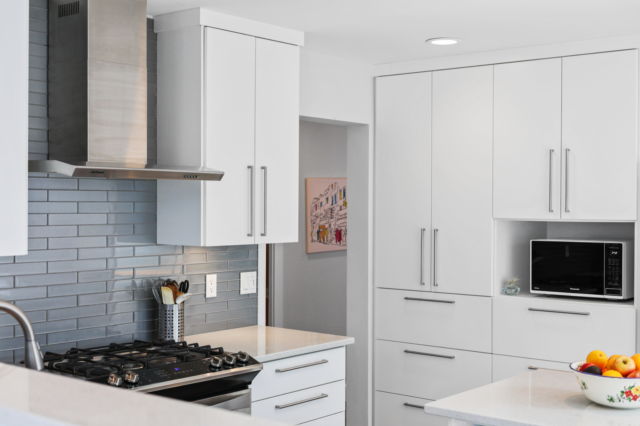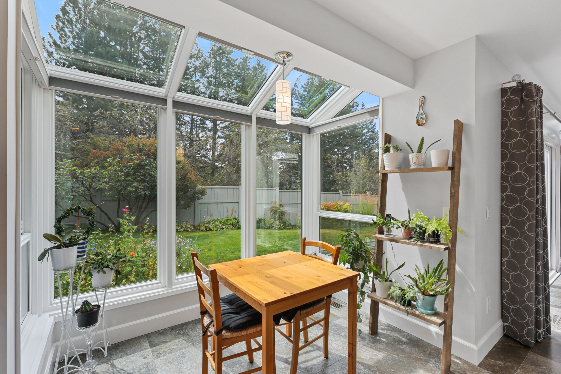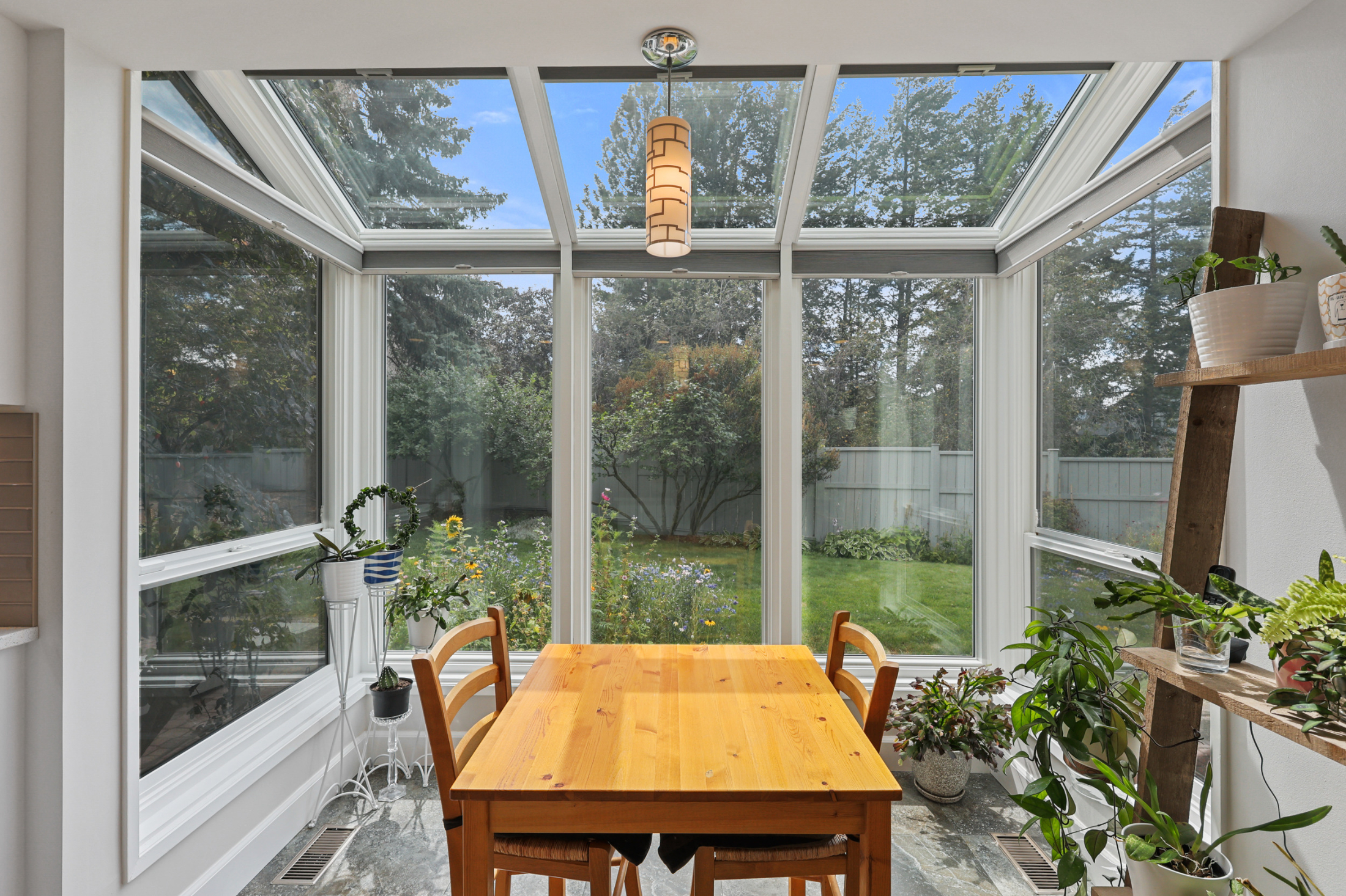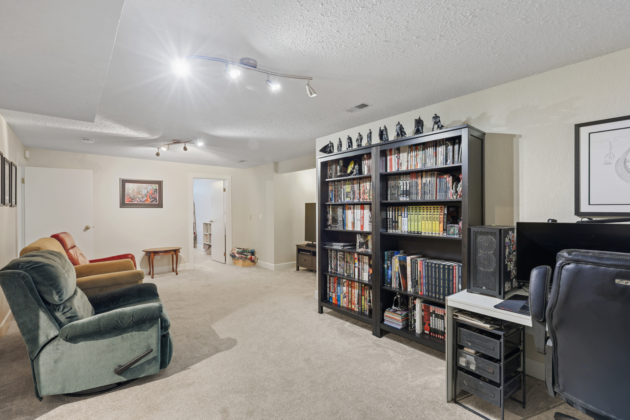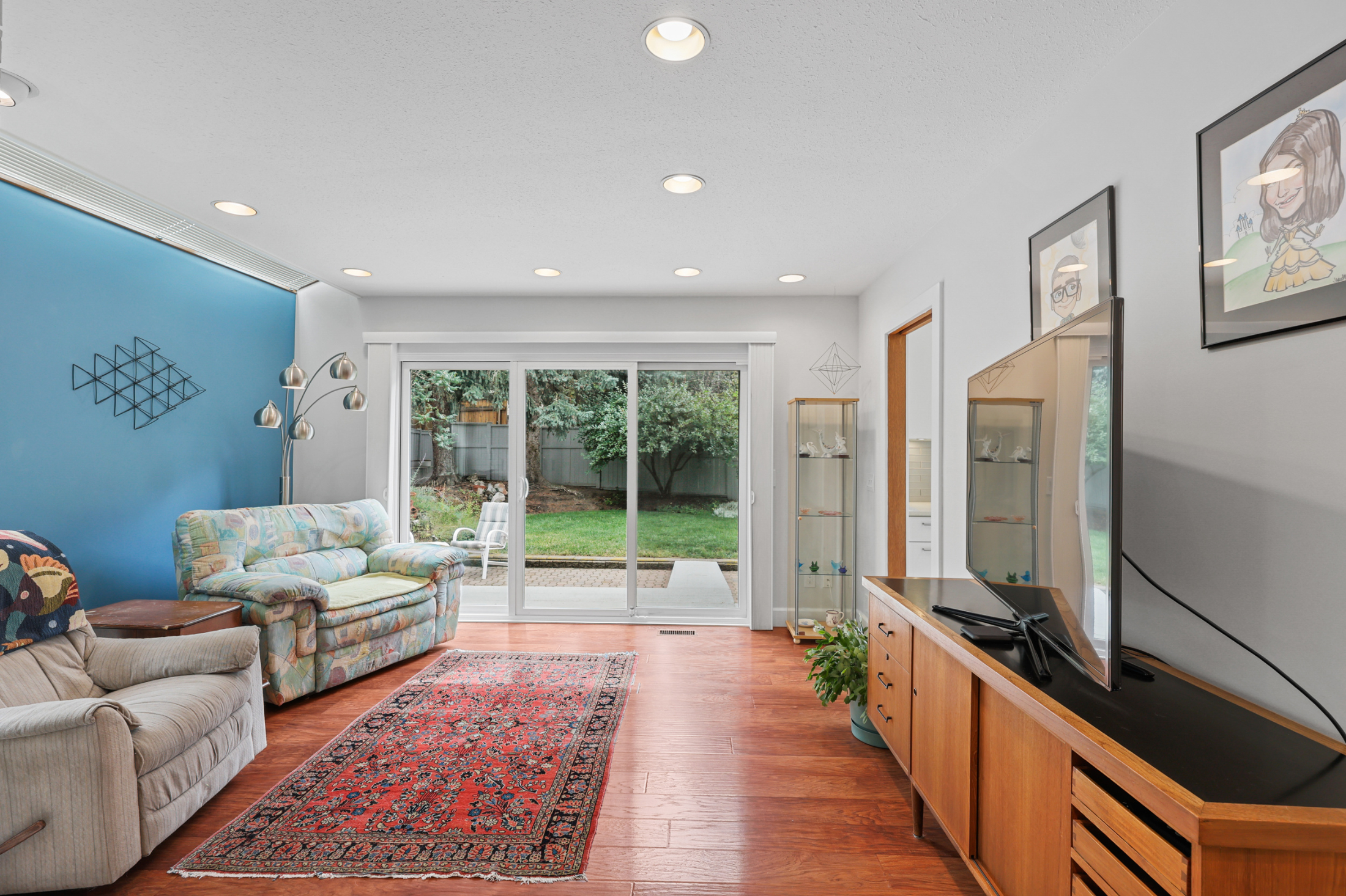 Off of the main entry there is a large formal living room with vaulted ceiling, updated fireplace, flooring and paint. The kitchen was fully gutted and renovated with white custom cabinetry and stone counters. There is a cute nook overlooking the flat private yard. Off of the kitchen there is a family room with yard access and an office space.