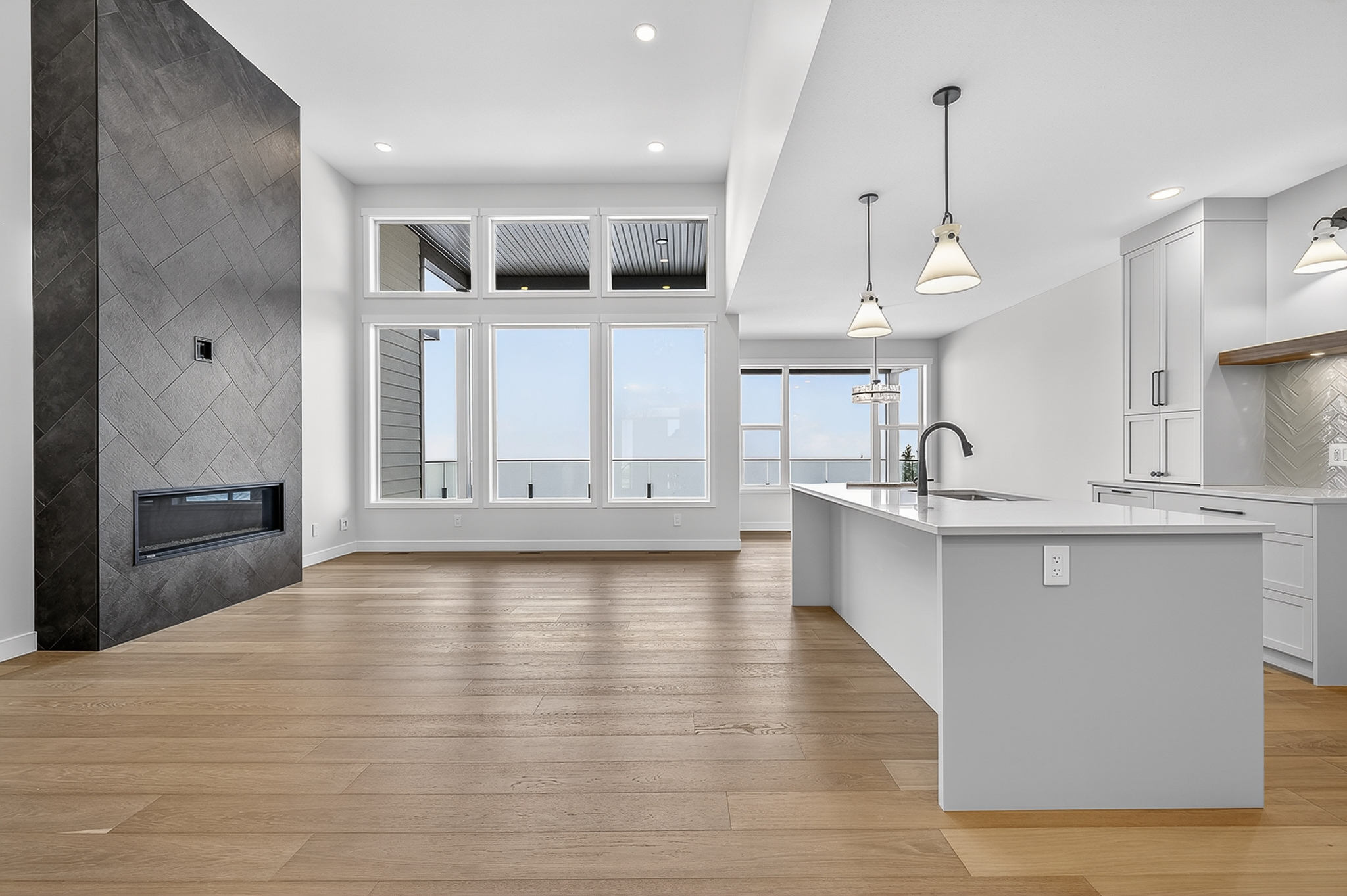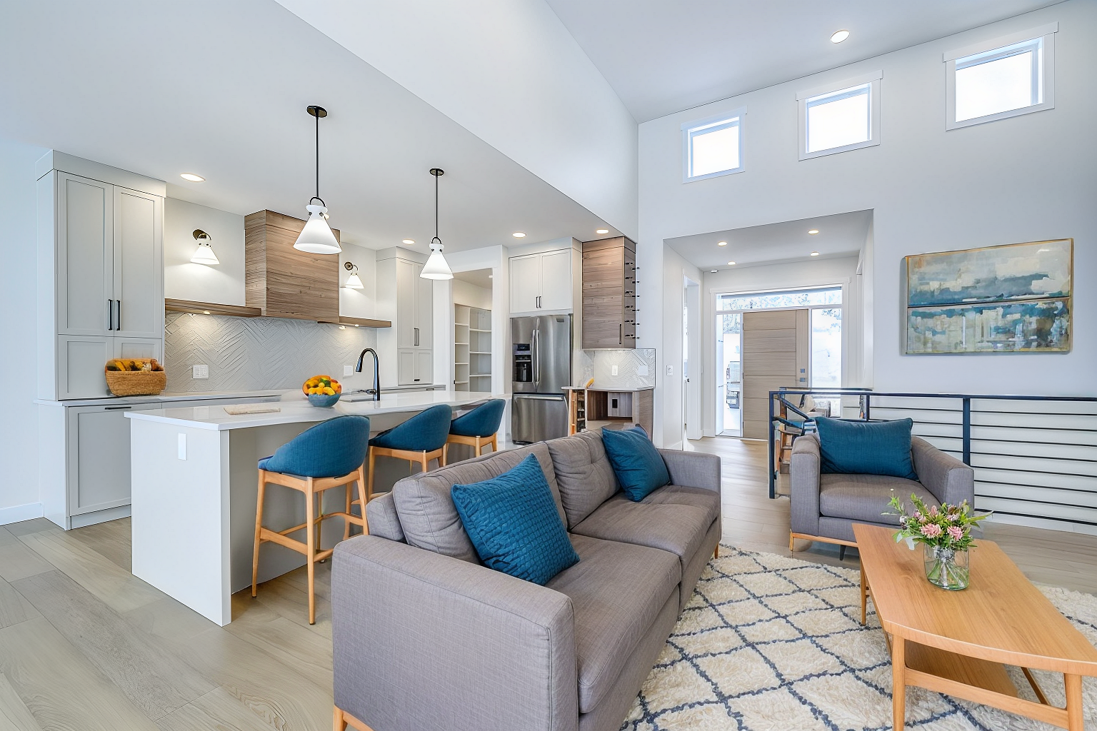 The main floor has a large kitchen with stone counters, island and good sized pantry. There is a dining room space and living room which has 14-foot ceilings and fireplace. Walk off the dining room to the large, covered deck.