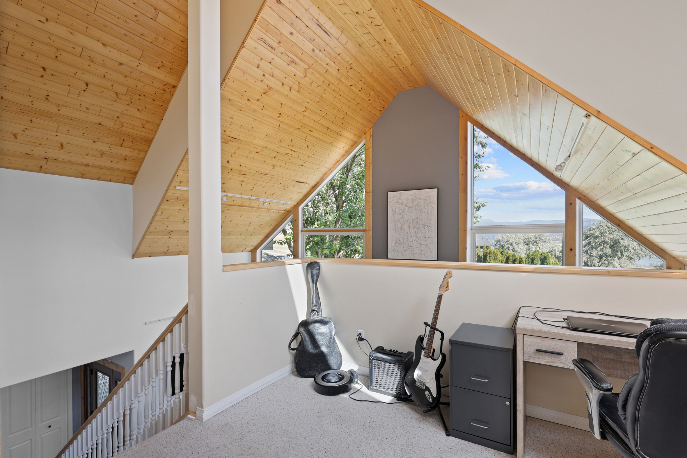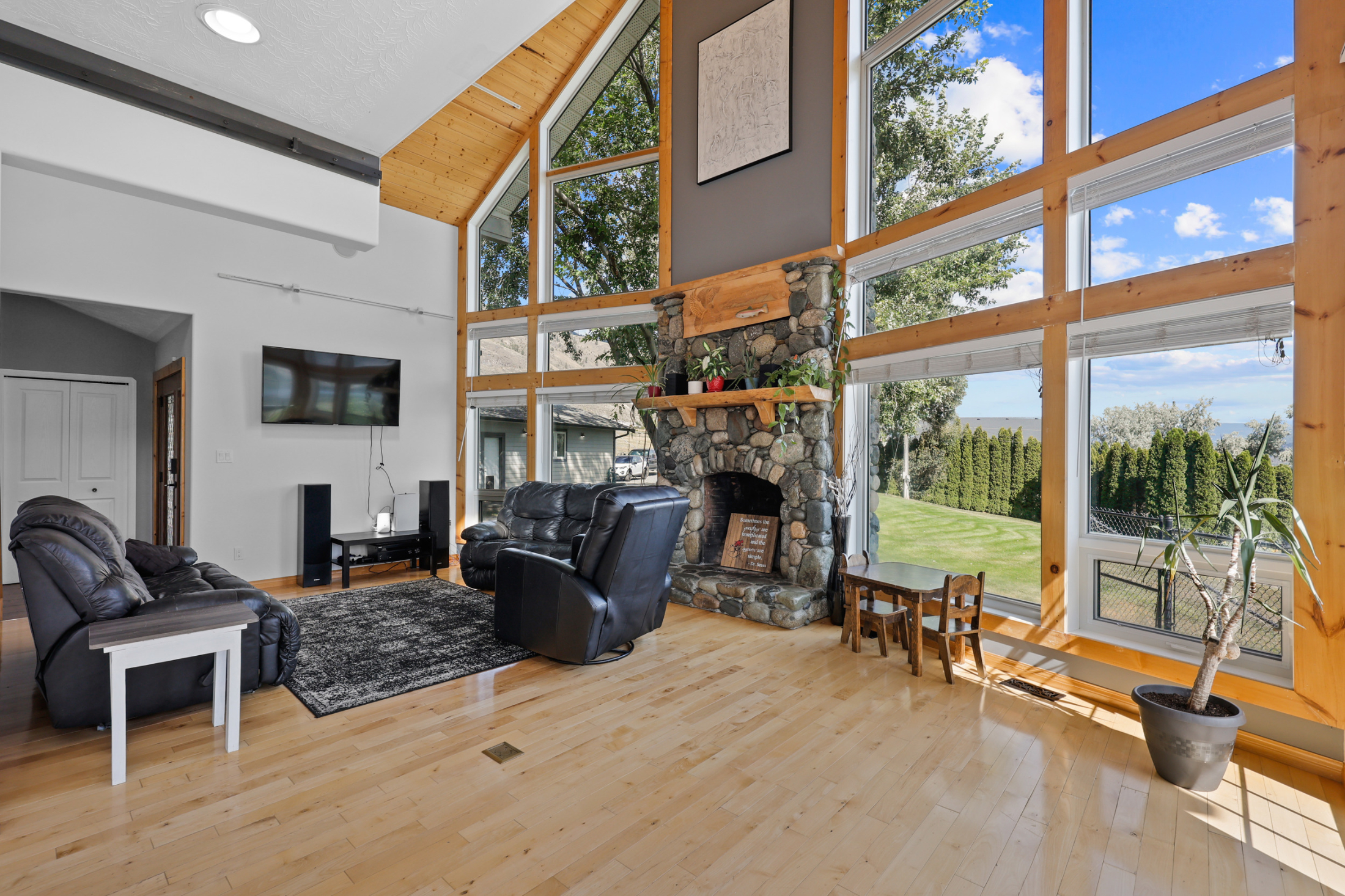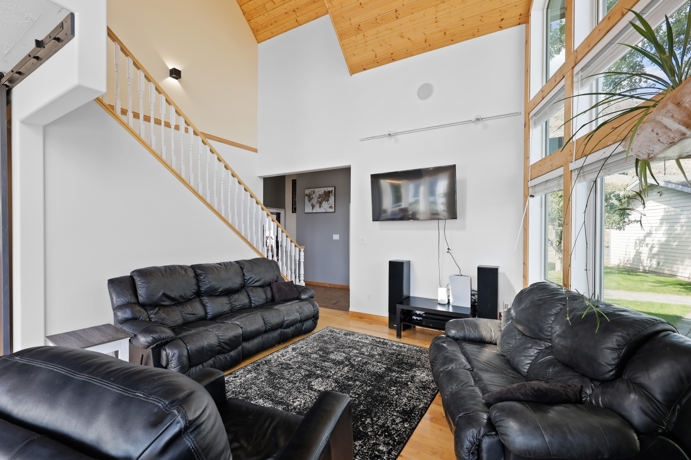 The beautiful living and dining room space features a large stone fireplace, hardwood flooring and many windows to draw in the natural light and stunning views. The kitchen is open to the living space and overlooks the deck and back yard where you will find an above ground pool with newly upgraded paving stone, wrap around deck space and hot tub. To finish up the main floor there is a laundry room with access to the backyard, 4 piece bathroom and 2 bedrooms. The top floor includes the primary bedroom with stunning vaulted ceiling, walk in closet and 5 piece en-suite along with a loft office/den space.