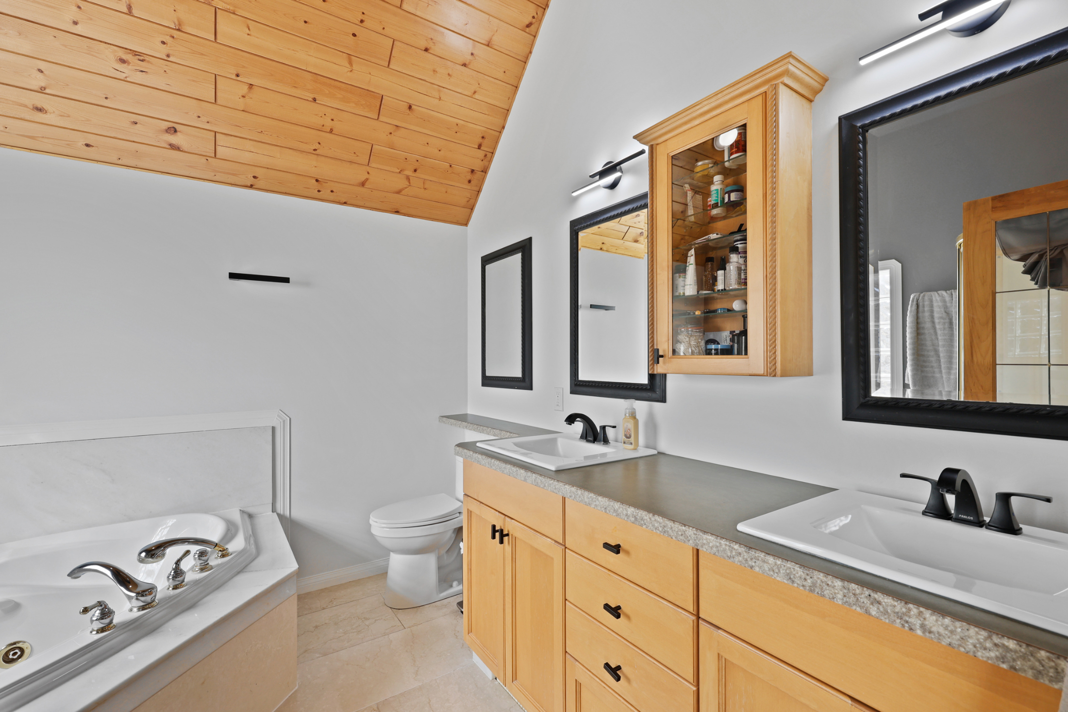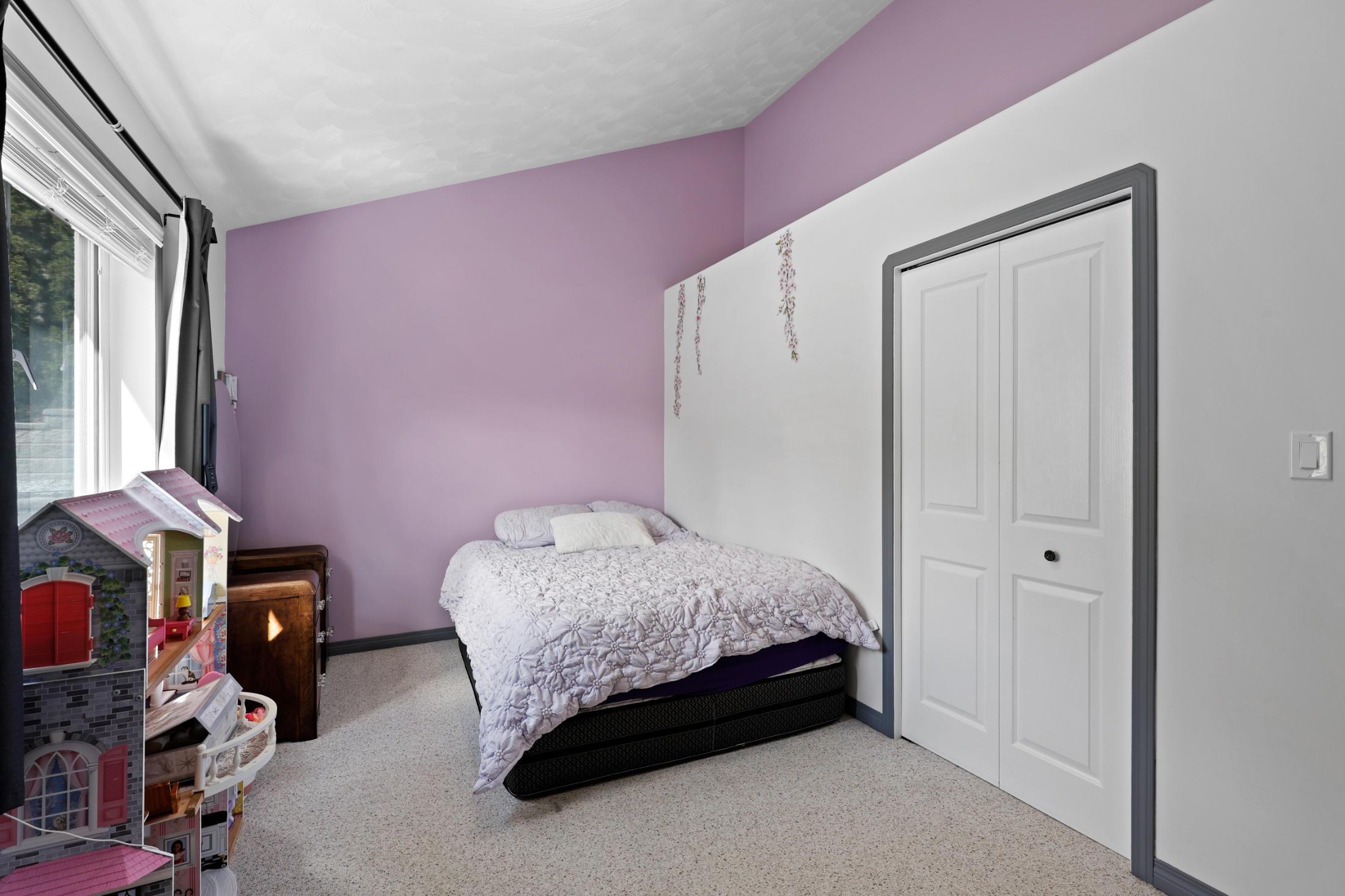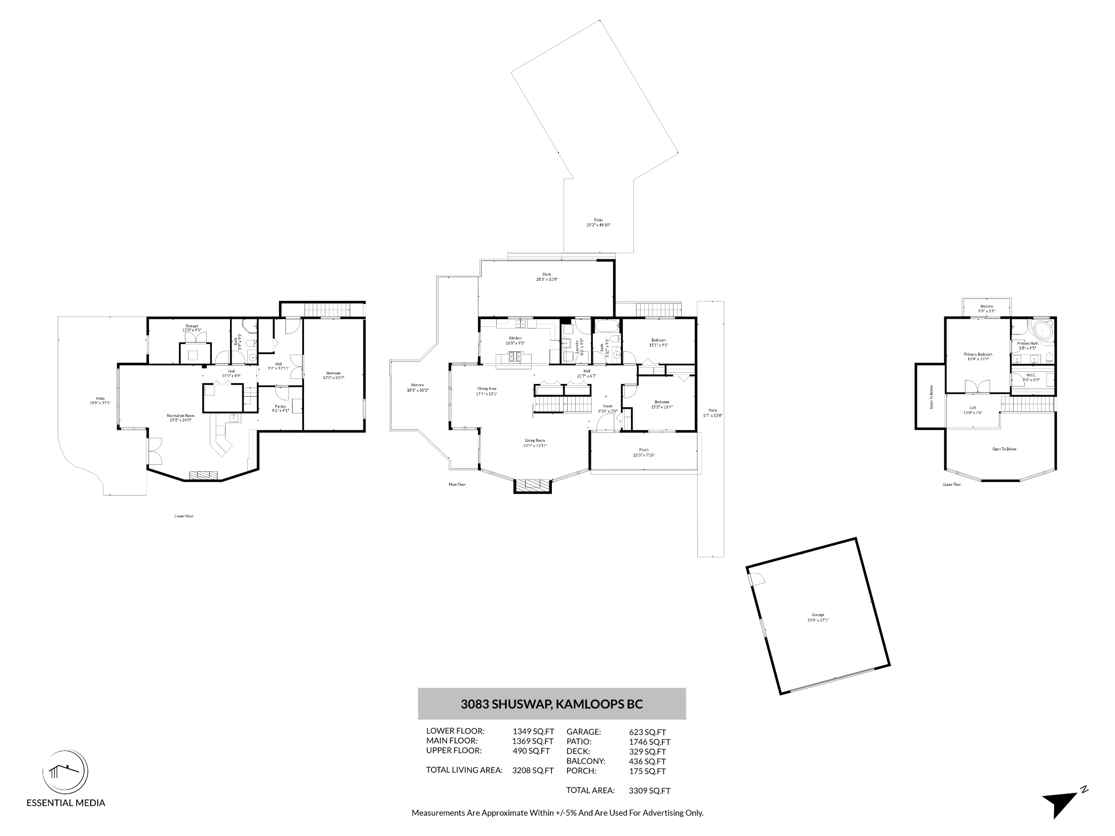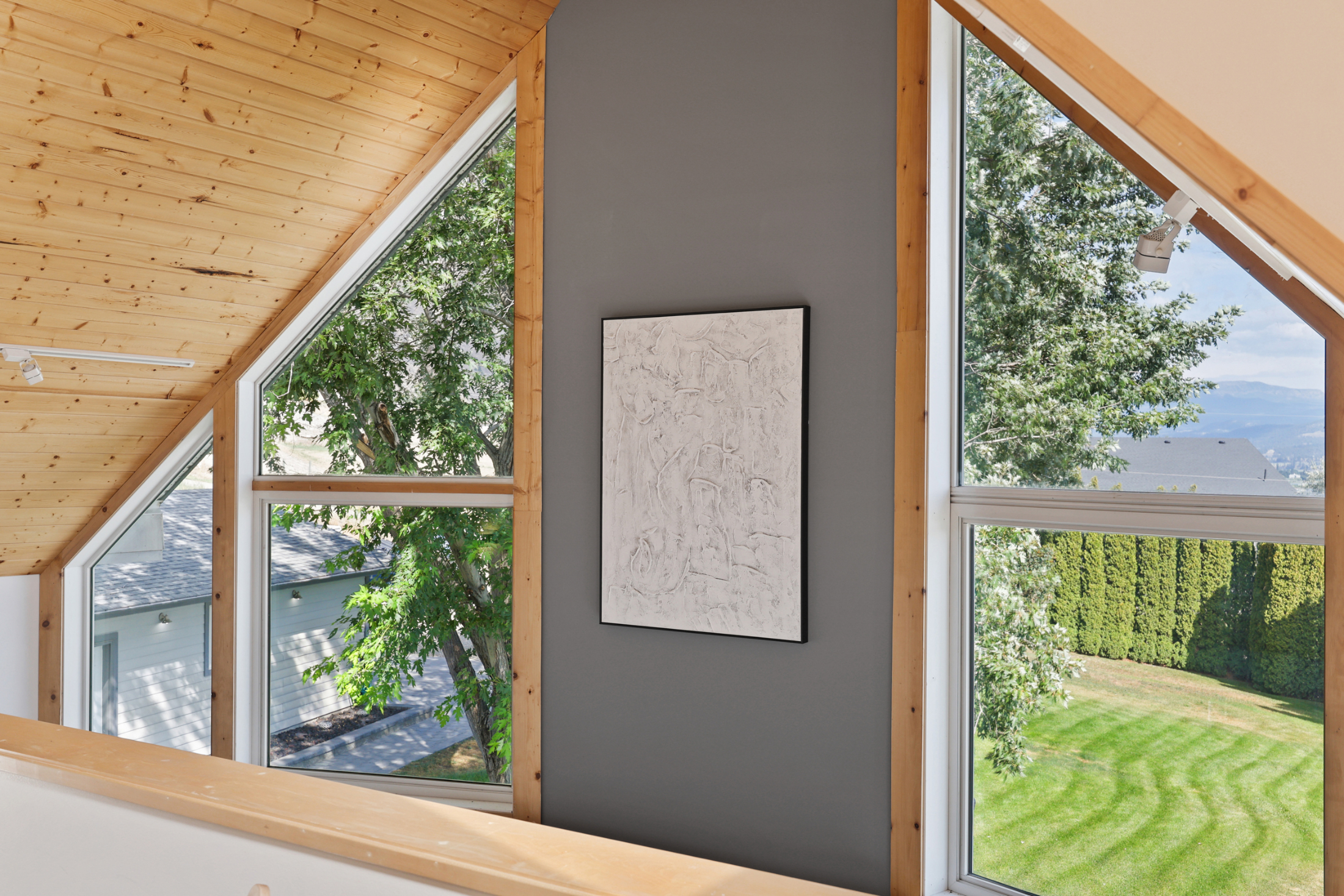 The beautiful living and dining room space features a large stone fireplace, hardwood flooring and many windows to draw in the natural light and stunning views. The kitchen is open to the living space and overlooks the deck and back yard where you will find an above ground pool with newly upgraded paving stone, wrap around deck space and hot tub. To finish up the main floor there is a laundry room with access to the backyard, 4 piece bathroom and 2 bedrooms. The top floor includes the primary bedroom with stunning vaulted ceiling, walk in closet and 5 piece en-suite along with a loft office/den space.