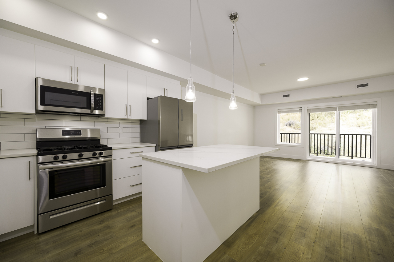 Walk into this home and you will find a nice sized kitchen with centre island, stainless steel appliances and stone counters. The main living space has the great room open plan design with laminate flooring throughout. The living room includes an electric fireplace and it walks out to the patio which overlooks the local trails and green space.