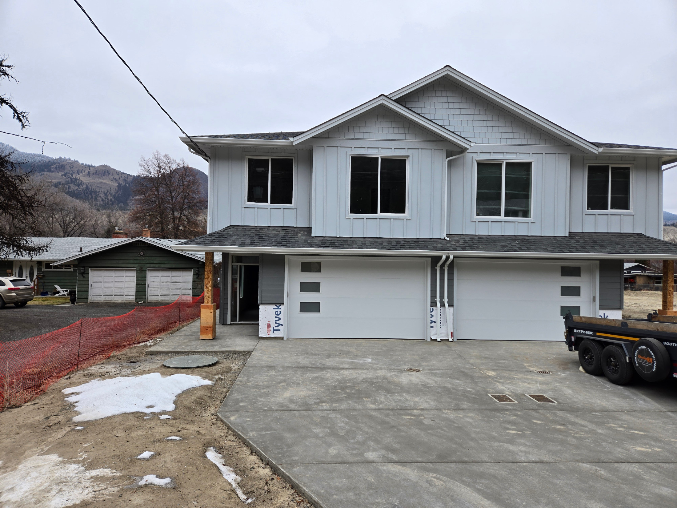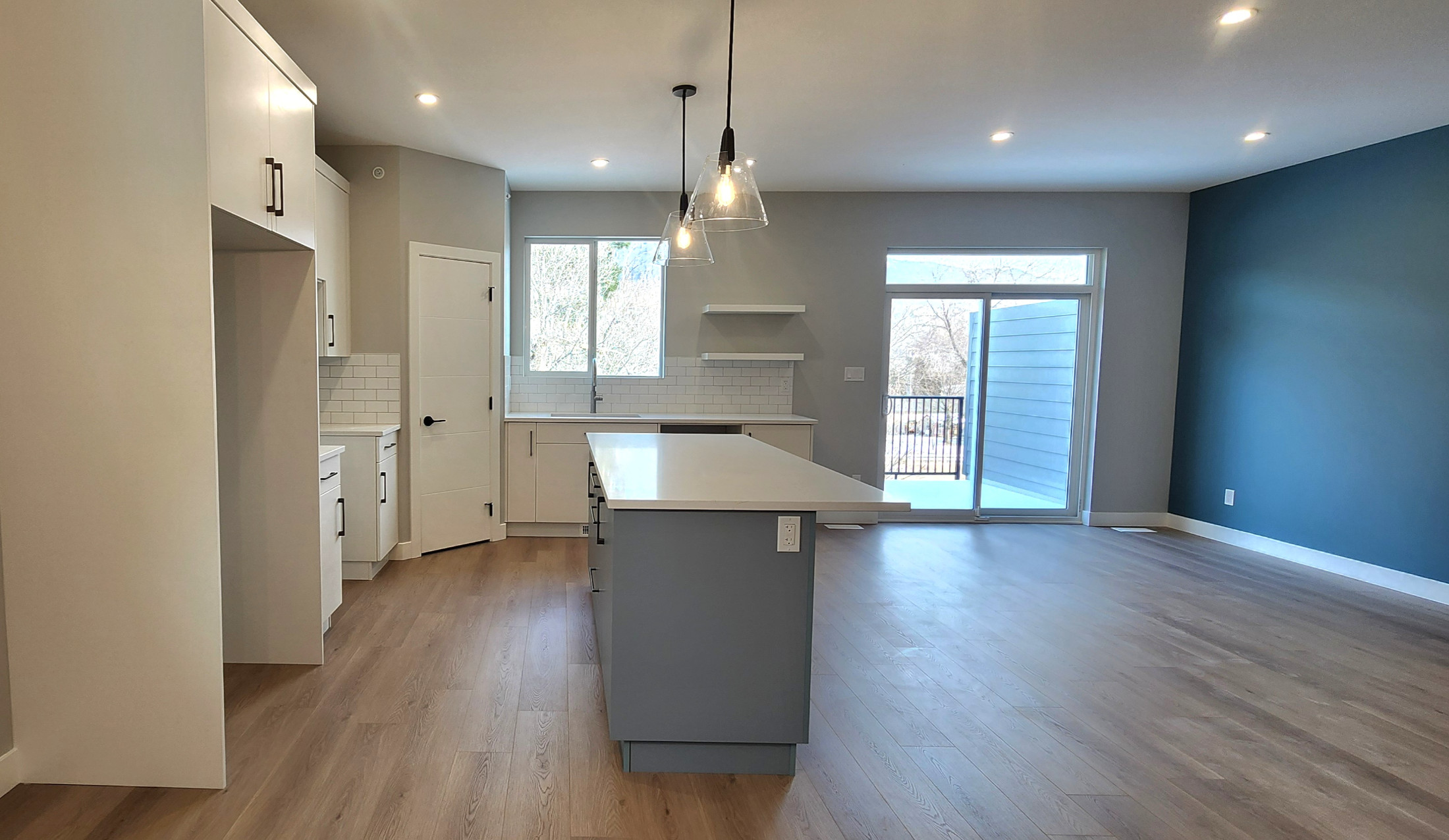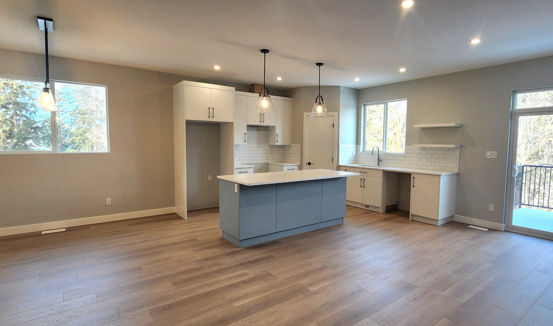 The main floor features a bright open-concept kitchen, living, & dining area which is great for entertaining. The kitchen has ample cupboard space + a large island with additional storage, a large pantry, & a kitchen window overlooking the backyard. In the living room there is a cozy fireplace feature with wiring for media above. Just off the living room is a deck with gas BBQ hookup and a great view of the mountains along the river.