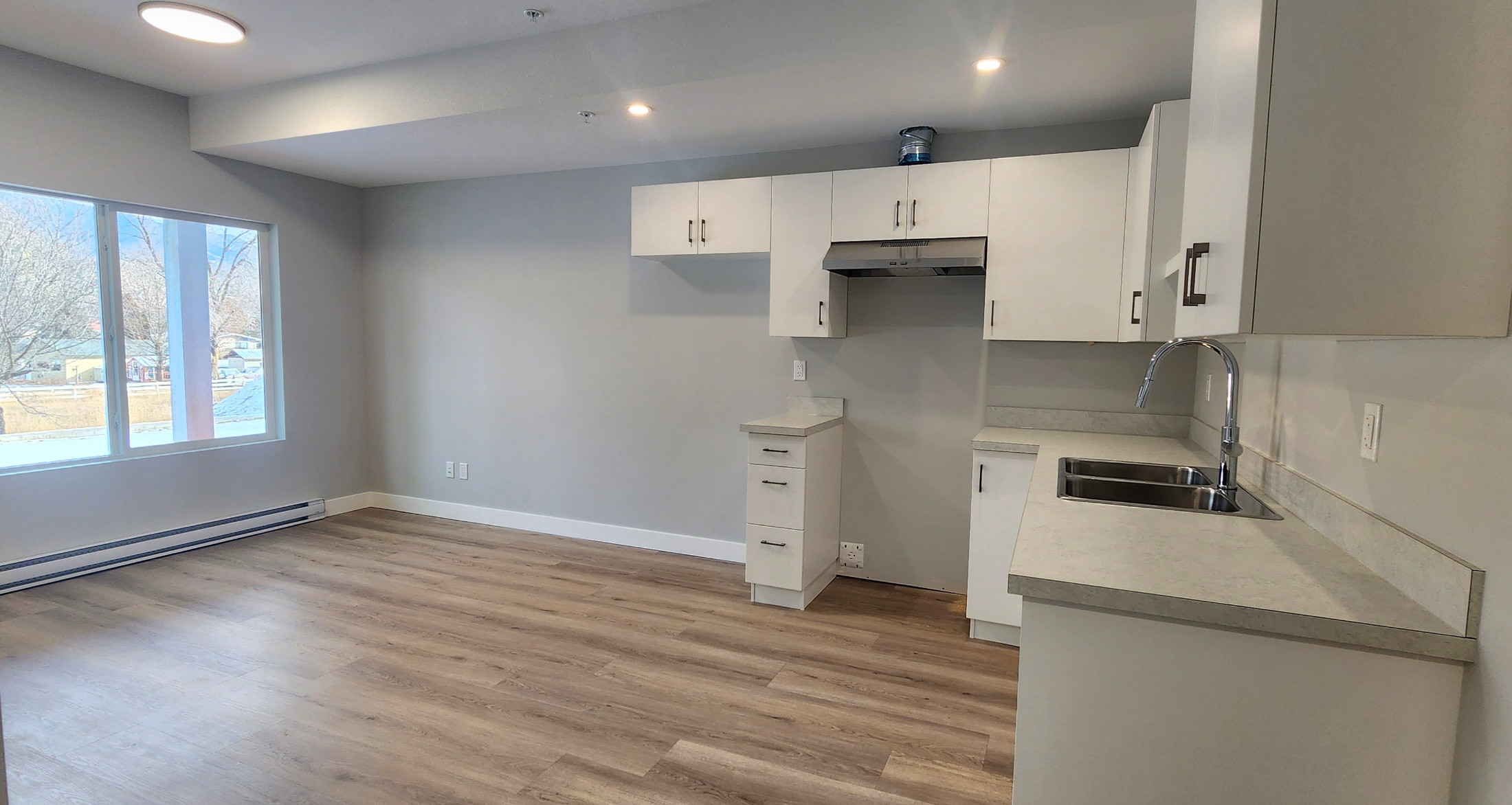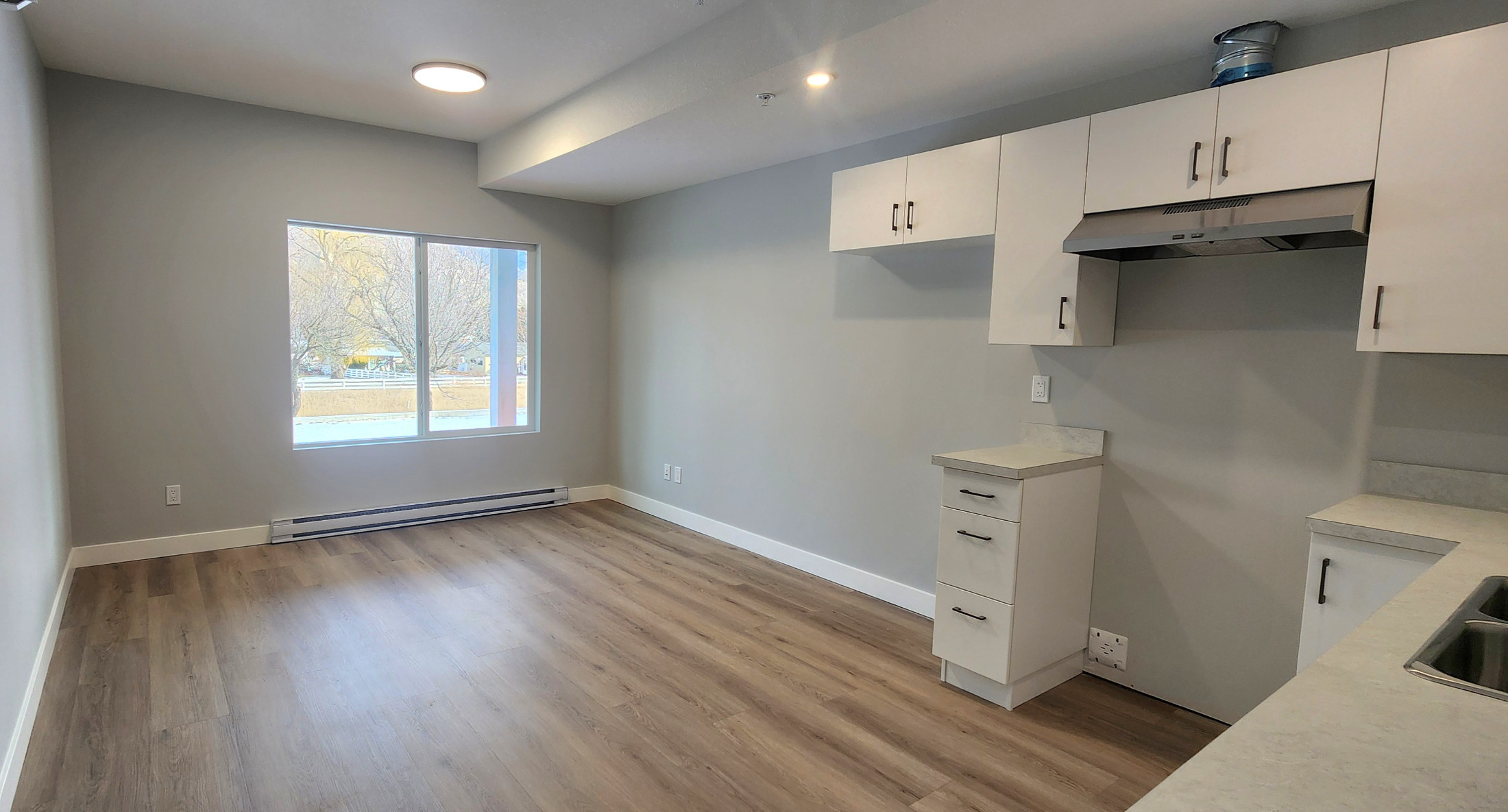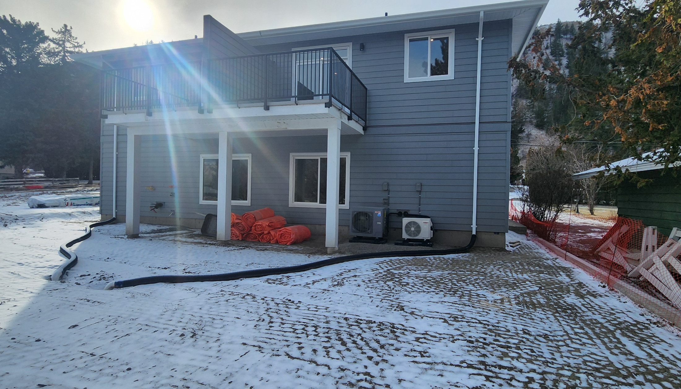 The main floor features a bright open-concept kitchen, living, & dining area which is great for entertaining. The kitchen has ample cupboard space + a large island with additional storage, a large pantry, & a kitchen window overlooking the backyard. In the living room there is a cozy fireplace feature with wiring for media above. Just off the living room is a deck with gas BBQ hookup and a great view of the mountains along the river.