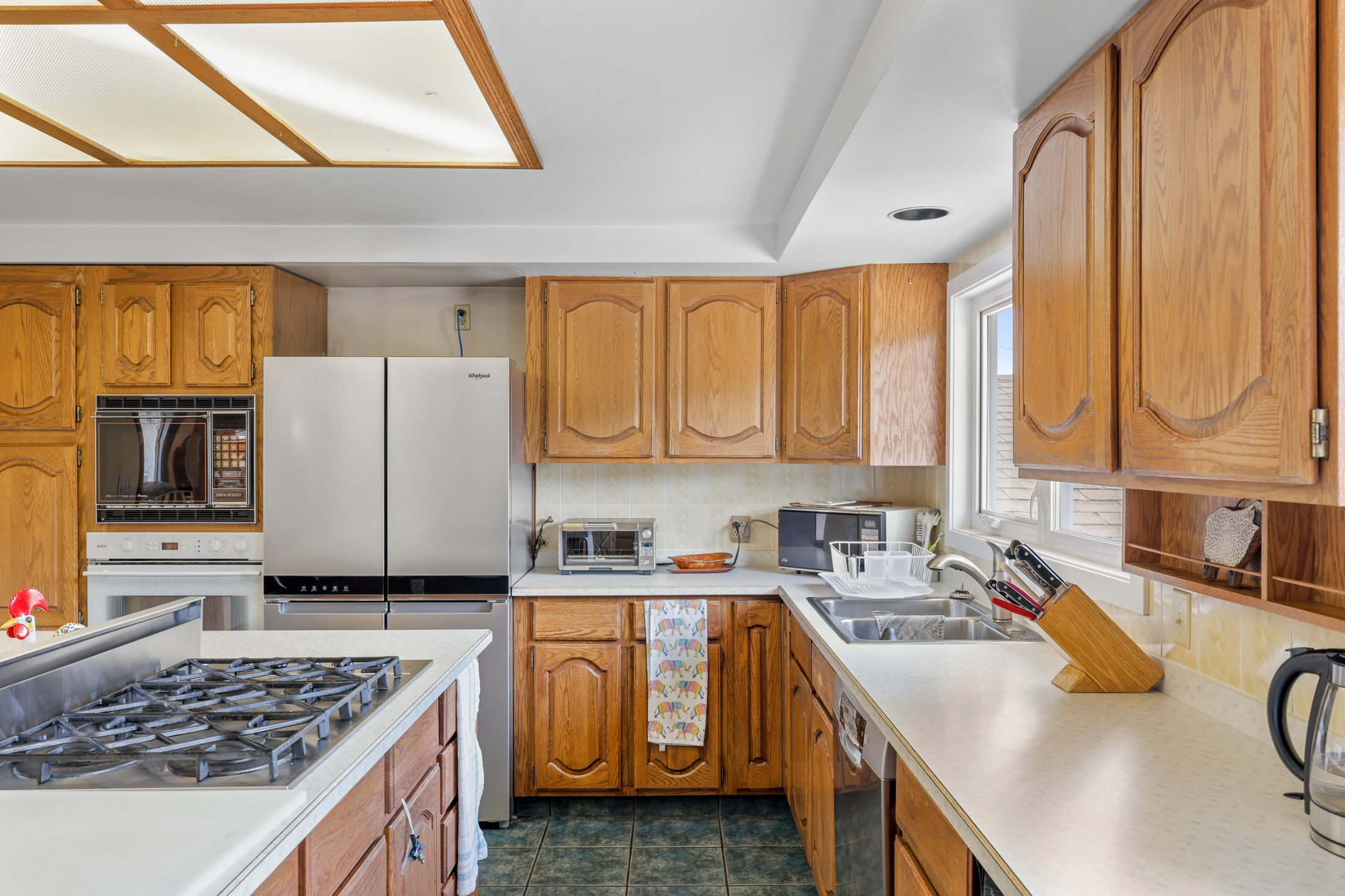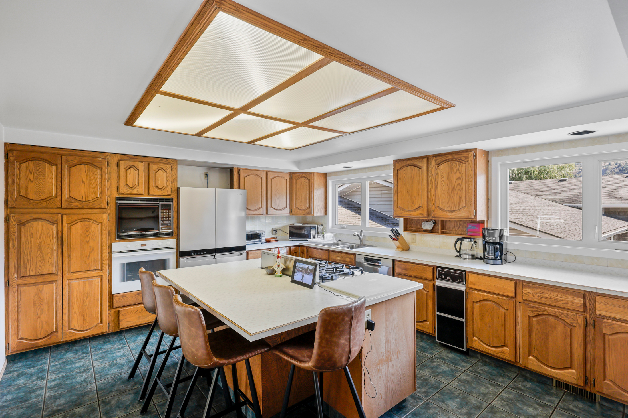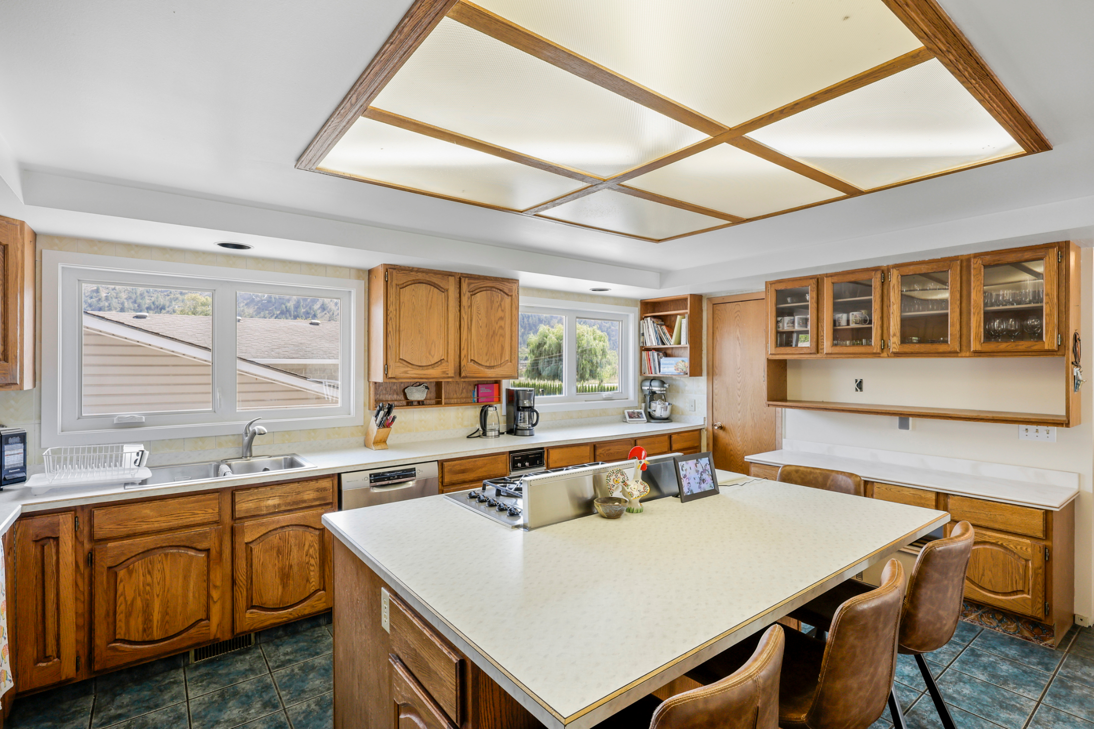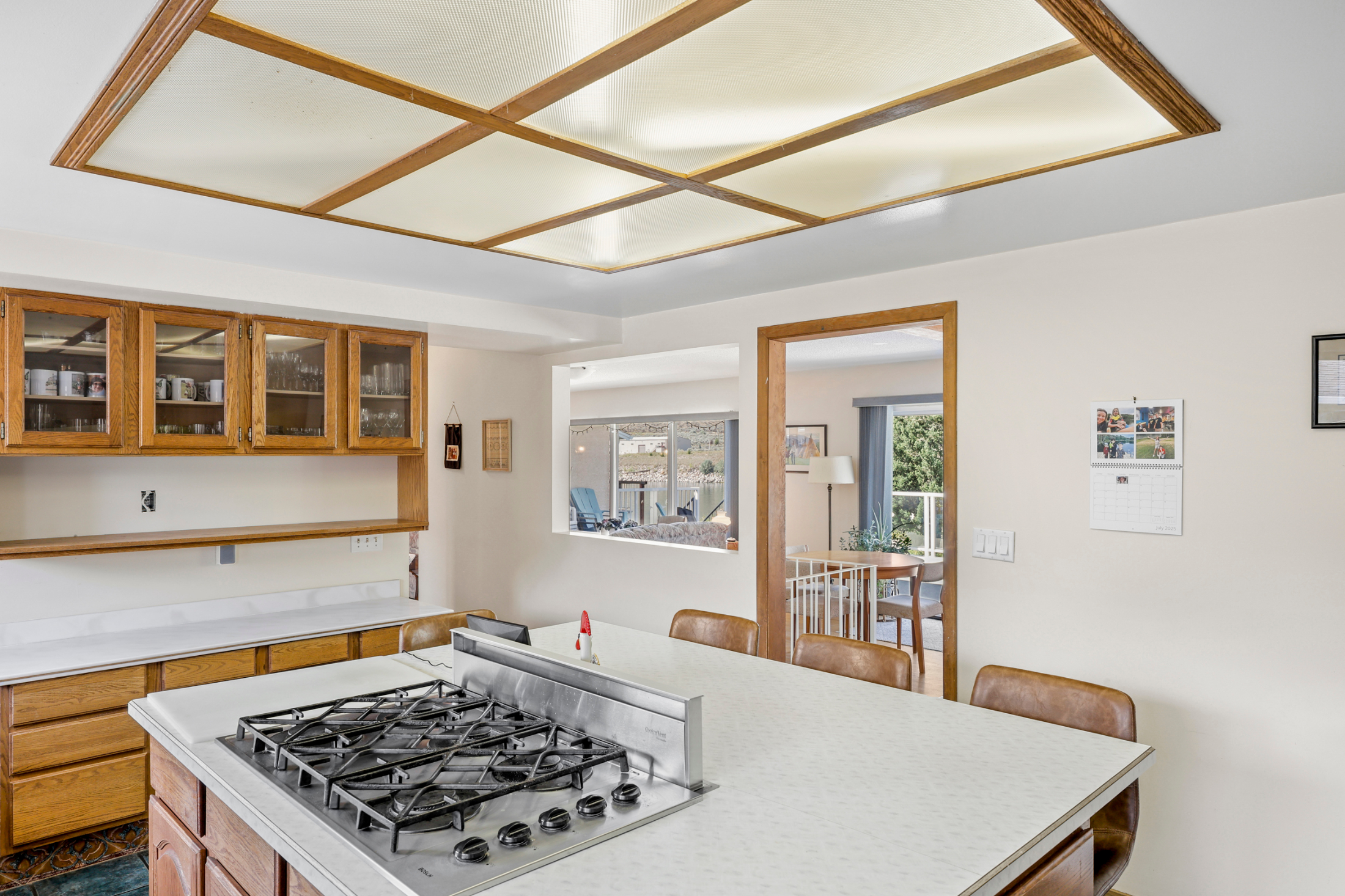 Upstairs, you will find all the main living space. The scenery will take your breath away! There are unobstructed river and mountain views out of the living and dining room windows which sprawl across this large space. The floor plan on the main floor is spacious and open with hardwood flooring and tile throughout. Walk off the living space to a massive deck which leads to the large rolling grassy yard. Tons of room for a pool or bring your landscaping ideas! There is also a secondary partially finished deck space off of the dining room. So much outdoor space to enjoy! The large kitchen is open to the main space and features a huge island and plenty of cupboard space.