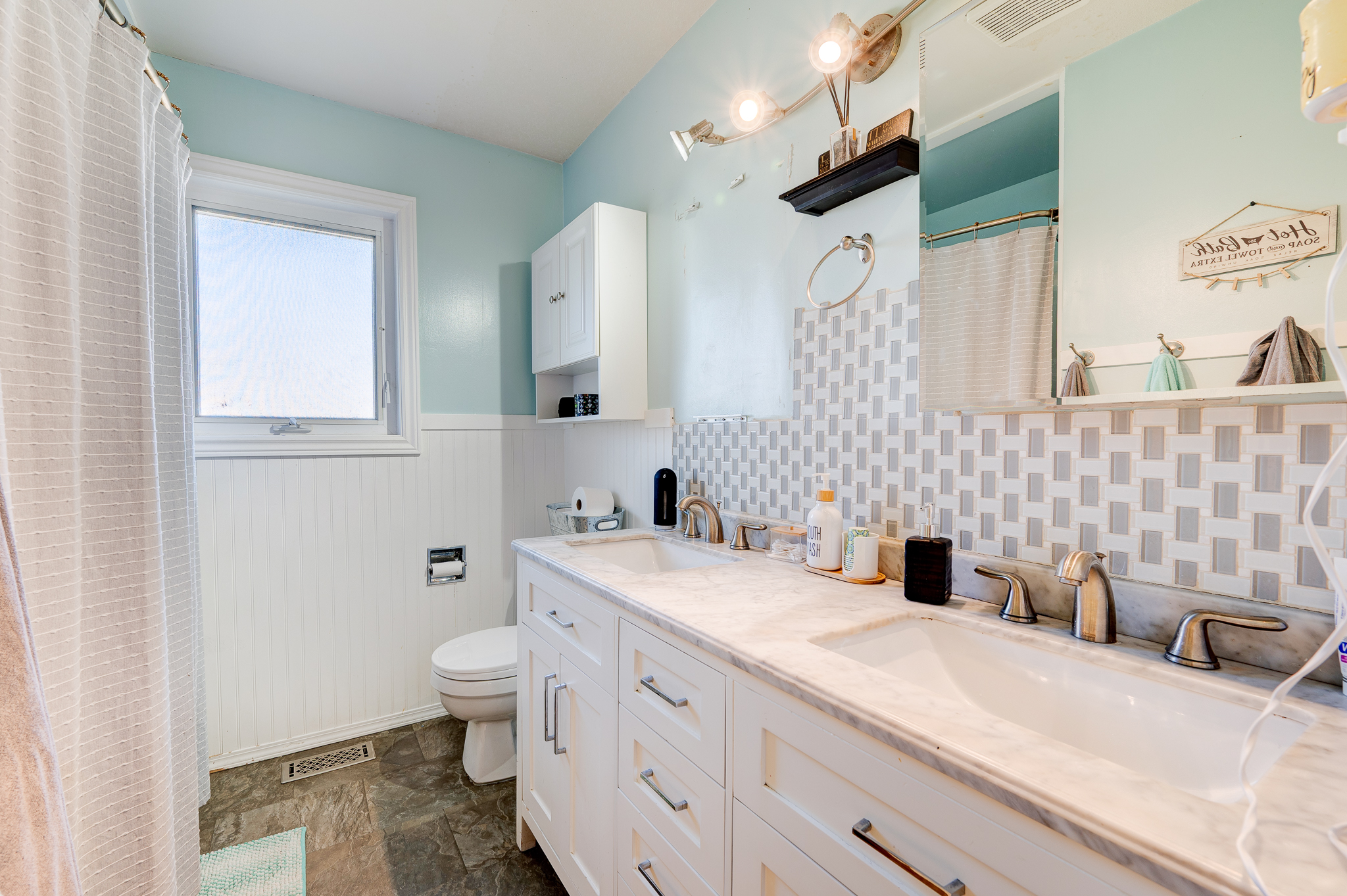 Enter into the main home through the front door and you will find a large mud room with storage and plenty of room to take off coats and boots. Separate laundry is also located on this level. Upstairs, there is a large living room which flows nicely through to the dining and kitchen area. The kitchen is bright and features stainless steel appliances and bar seating. Off the kitchen is a large covered deck with stairs leading to the flat, fully-fenced yard. Both the kitchen and dining areas feature large windows, bringing in plenty of natural light into the home. Also upstairs are 3 spacious bedrooms and an updated 5-piece bathroom with a double vanity.